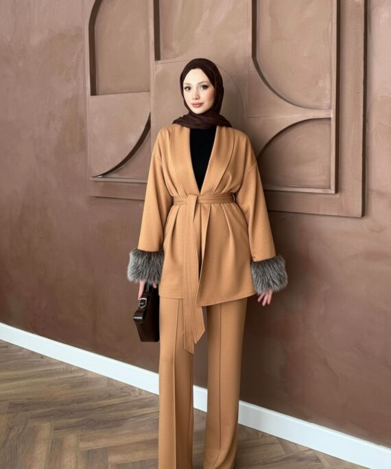 Kürk Kol Detaylı Pantolonlu Takım – Camel