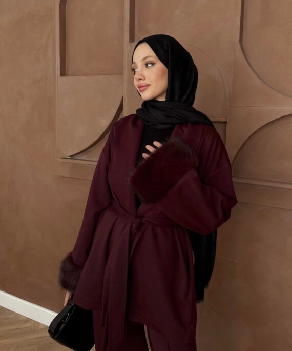 Kürk Kol Detaylı Pantolonlu Takım – Bordo