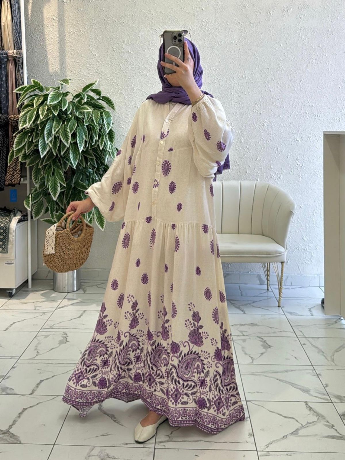 Rahatlık ve etnik romantizm aynı parçada buluştu. Ketenimsi dokulu bej zemin, üst gövdede dağınık lavanta medalyon baskılarıyla hafif; etek ucunda yoğun mor paisley-çiçek bordürüyle güçlü bir kontrast yaratır. Bol kesimli kollar, önden düğmeli üst panel ve katlı volanlı maxi boy form gün boyu konfor sunar. Tesettür giyime uyumlu tam kapatıcılıkta olduğu için bayram ziyaretlerinden tatil sokaklarına kadar her yerde giyilebilir.