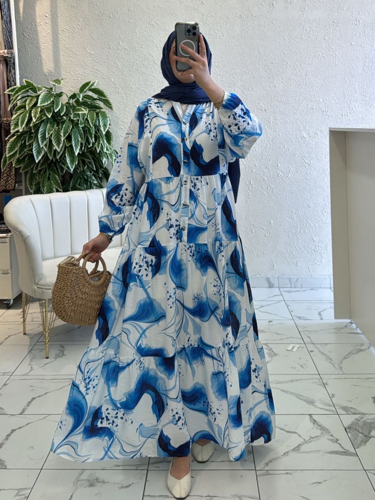 Okyanus dalga efektli mavi ton desenleriyle ferahlık veren kat kat maxi elbise. Hafif, nefes alır dokulu kumaşı ve rahat oversize kesimiyle yaz günlerinde serin ve konforlu; yarım düğmeli yuvarlak yaka hattı pratik giy‑çıkar sağlar. Bileğe doğru toplanan hacimli kollar ve geniş hareket alanı sunan kloş kat etek elbiseye akışkan bir siluet kazandırır. Günlük şehir stili, sahil gezileri ve yaz davetleri için kolayca şal/aksesuarla kombinlenir.