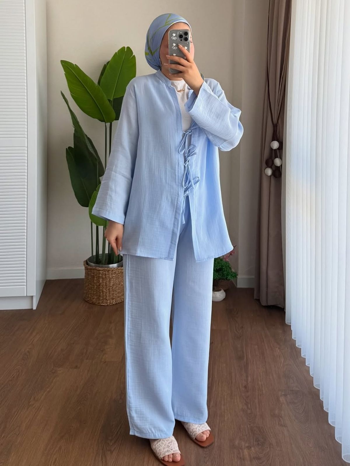 Ferahlık hissi veren açık mavi tonuyla tasarlanan bu takım, salaş kesimi ve bağcık detaylarıyla modern bir şıklık sunuyor. Hafif ve nefes alan kumaşı sayesinde özellikle yaz ve bahar aylarında rahatlıkla kullanılabilir. Minimal tasarımıyla günlük şıklığı yansıtırken, konforu da ön planda tutar.