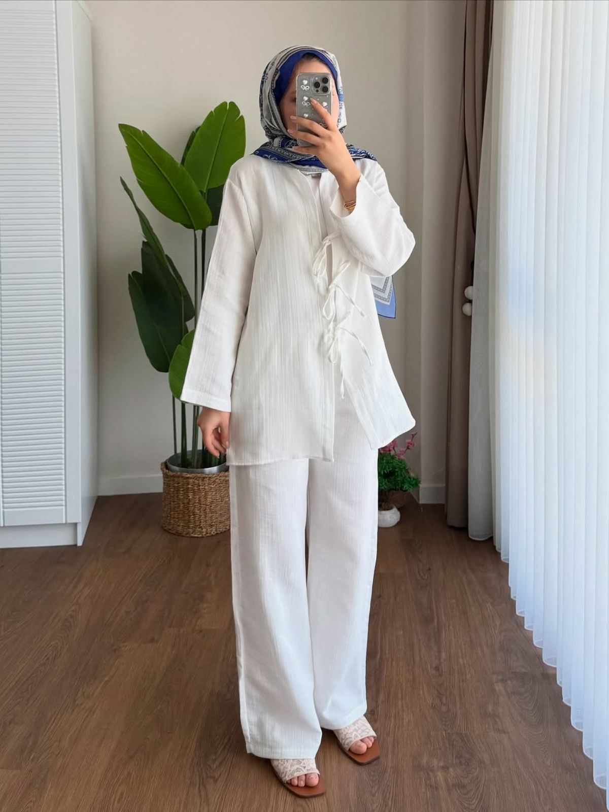 Minimalist tarzıyla öne çıkan beyaz takım, hafif dokusu ve salaş kesimiyle gün boyu konfor sunuyor. Ön kısmındaki bağcık detayı modern bir dokunuş katarken, sade tasarımı sayesinde hem günlük kombinlerde hem de şık davetlerde rahatlıkla kullanılabilir. Yaz ve bahar ayları için ferah bir tercih arayanlar için ideal.