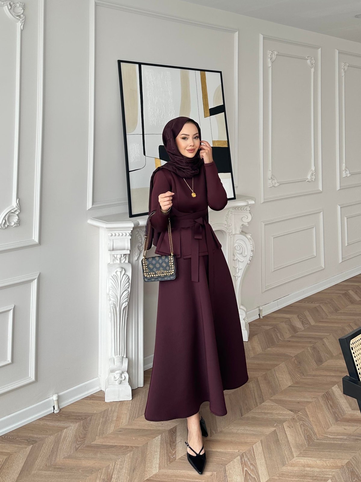 Siyahın asaletini modern bir dokunuşla birleştiren bu scuba etekli takım ile stilinizi konuşturun. Bel vurgulu ceket ve kloş etek kesimi sayesinde hem şık hem de rahat bir görünüm elde edin. Spor ayakkabı ile kombinleyerek havalı, dinamik bir tarz yakalayın!