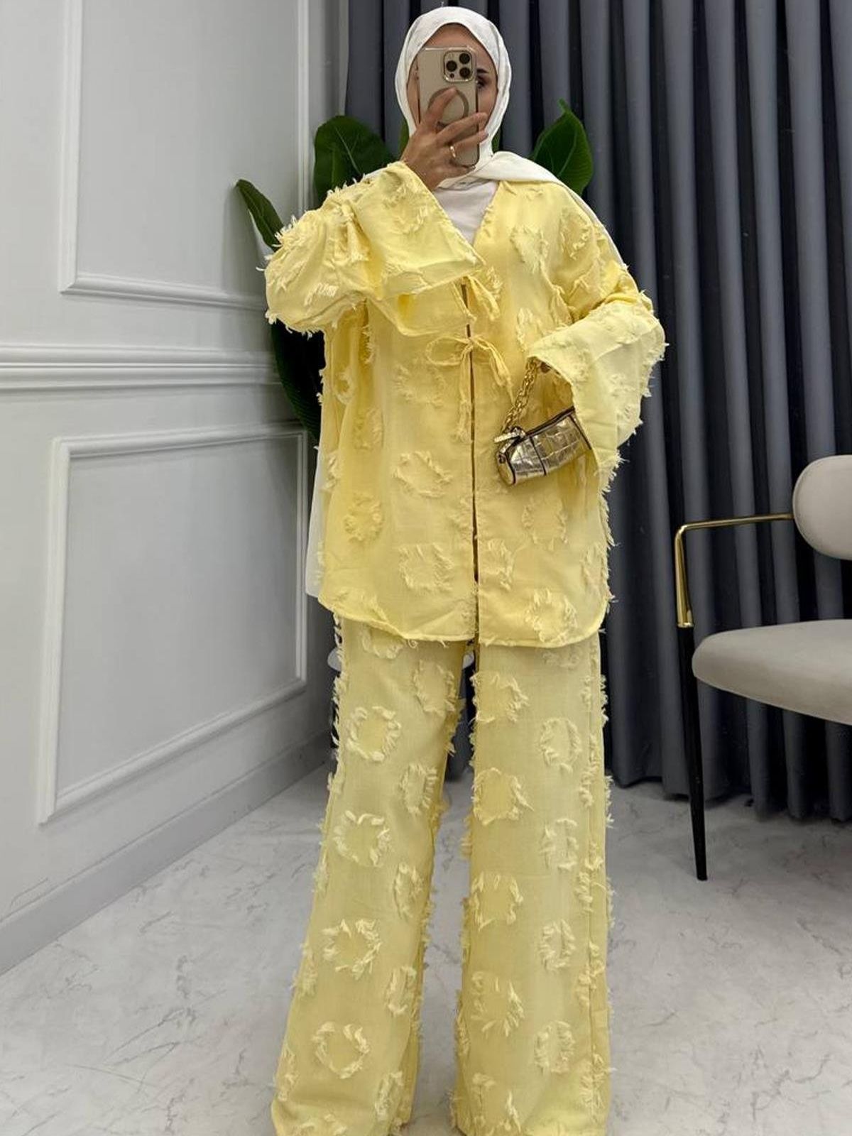 Canlı ve enerjik sarı tonuyla öne çıkan bu takım, modern ve rahat kesimiyle günlük kombinlerinize şıklık katıyor. Üzerindeki hafif dokulu desenleriyle hareketli bir görünüm sunarken, ferah yapısıyla yaz ve bahar aylarında konforlu bir kullanım sağlar. Ön kısmındaki bağcık detayı şık bir dokunuş eklerken, geniş paçalı pantolonu ile rahatlık ve stil bir arada sunuluyor.