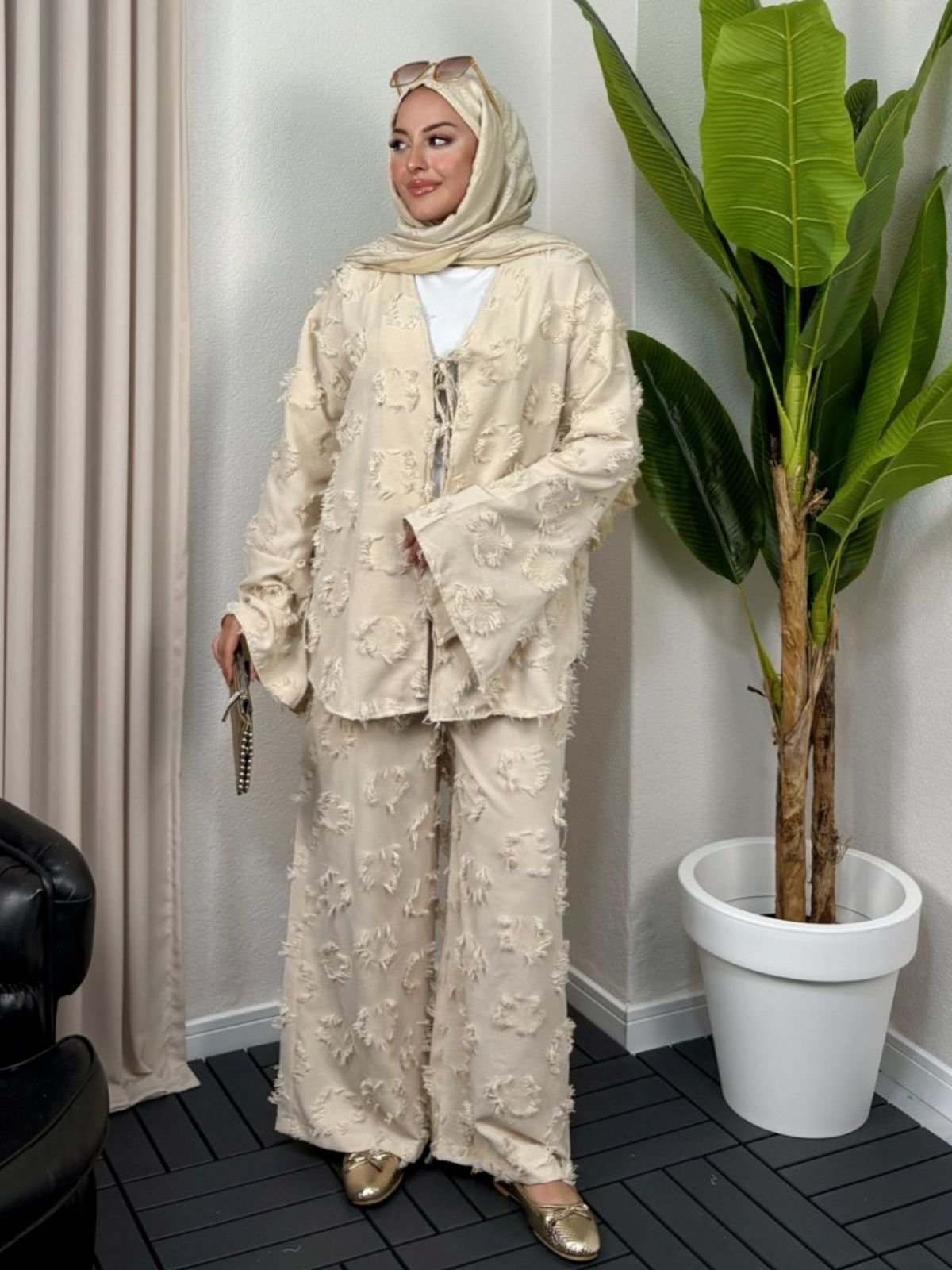 Natürel ve sofistike tonuyla öne çıkan bu bej takım, hafif dokulu kumaşı ve salaş kesimiyle rahatlığı şıklıkla buluşturuyor. Ön kısmındaki bağcık detayıyla modern bir hava kazanan takım, hem günlük kullanım hem de özel gün kombinleri için ideal bir seçenek. Nefes alan kumaşı sayesinde yaz ve bahar aylarında konfor sunar.