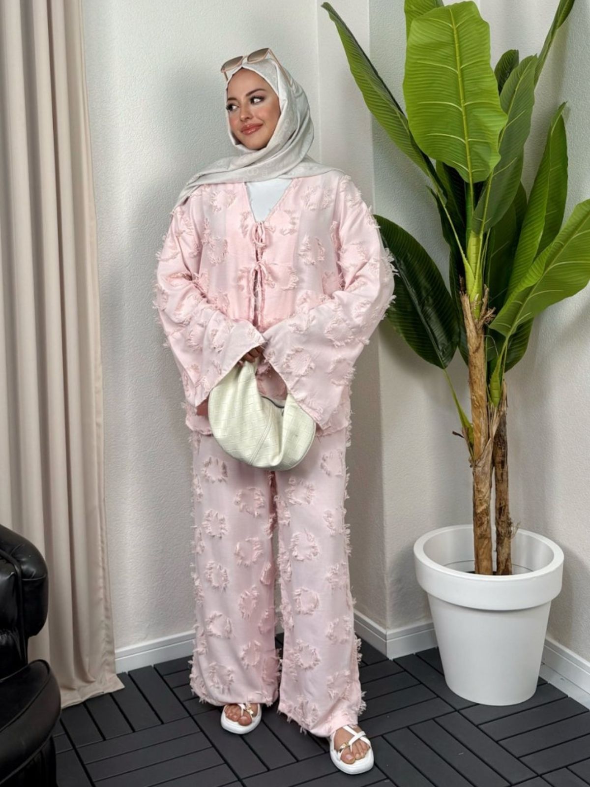 Pastel pembenin zarif tonu ile tasarlanan bu takım, dokulu kumaşı ve salaş kesimiyle konforlu bir şıklık sunuyor. Ön kısmındaki bağcık detayları modern bir hava katarken, hafif yapısı sayesinde yaz ve bahar aylarında rahatlıkla kullanılabilir. Günlük stilinize romantik ve soft bir dokunuş eklemek isteyenler için ideal bir tercih.