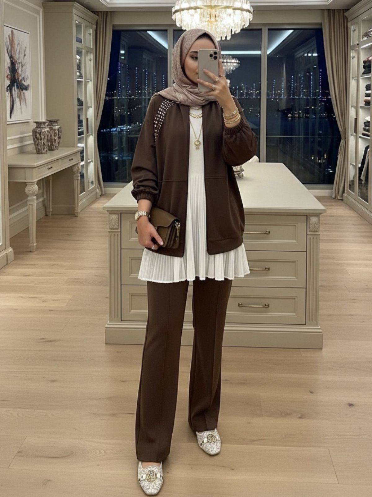 Hem günlük şıklıkta hem özel davetlerde rahatlıkla tercih edilebilecek bu takım, modern zarafeti geleneksel dokunuşlarla buluşturuyor.