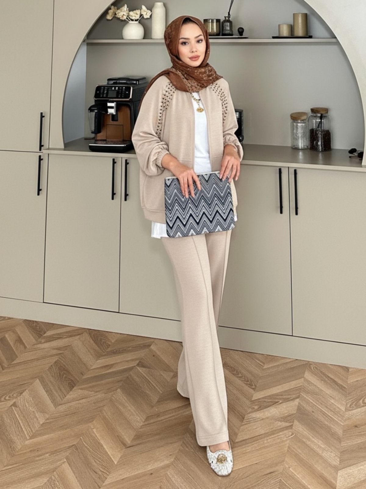Taş renginin yumuşak ve zarif etkisi, takımı hem gündüz hem akşam kombinlerinde kullanılabilir hâle getirir.
