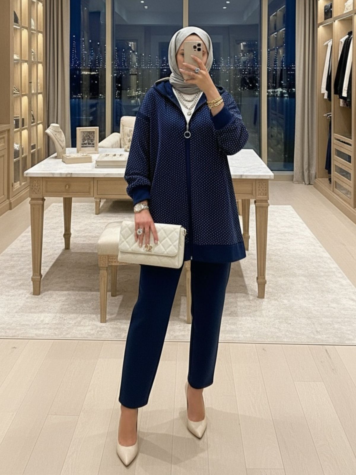 • Üst Parça: Kapüşonlu ve fermuarlı, rahat kesimli (oversize) ceket/sweatshirt. Ürünün tamamına serpiştirilmiş parlak taş işlemeleri ile dinamik ve iddialı bir görünüm sunar. Yumuşak ve tok bir yapıya sahiptir. (Kumaş türü belirtilmediği için genel bir ifade kullanılmıştır.)