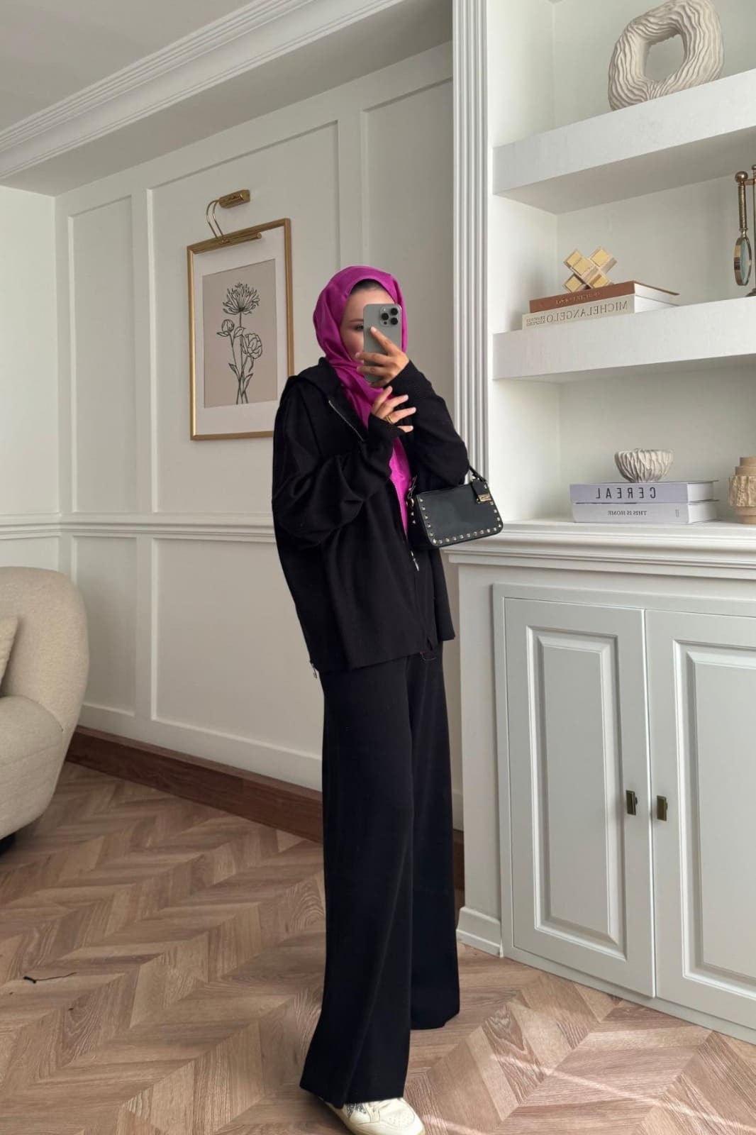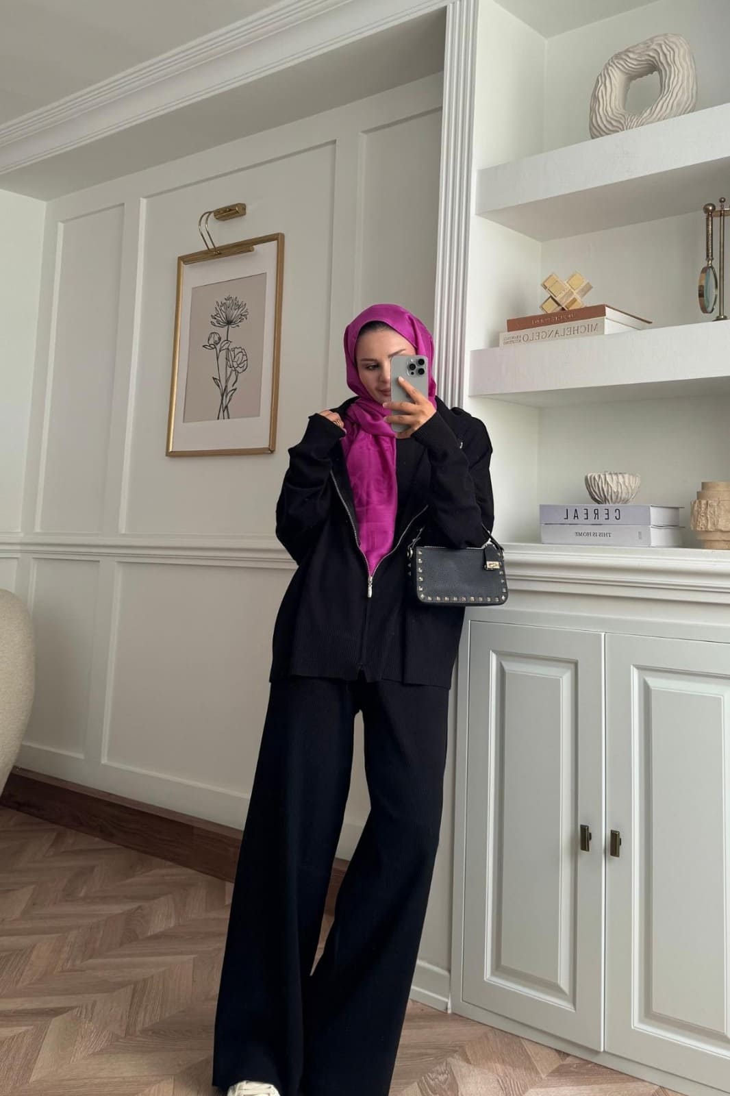- Tasarım: Kapüşonlu üst ve paçası hafif bol kesim pantolondan oluşan bu takım, modern ve sportif bir çizgiye sahiptir. Üst kısmındaki kapüşon, hem şık bir detay hem de ekstra sıcaklık sağlar. Takımın dökümlü triko yapısı, gün boyu konforlu bir kullanım sunar.