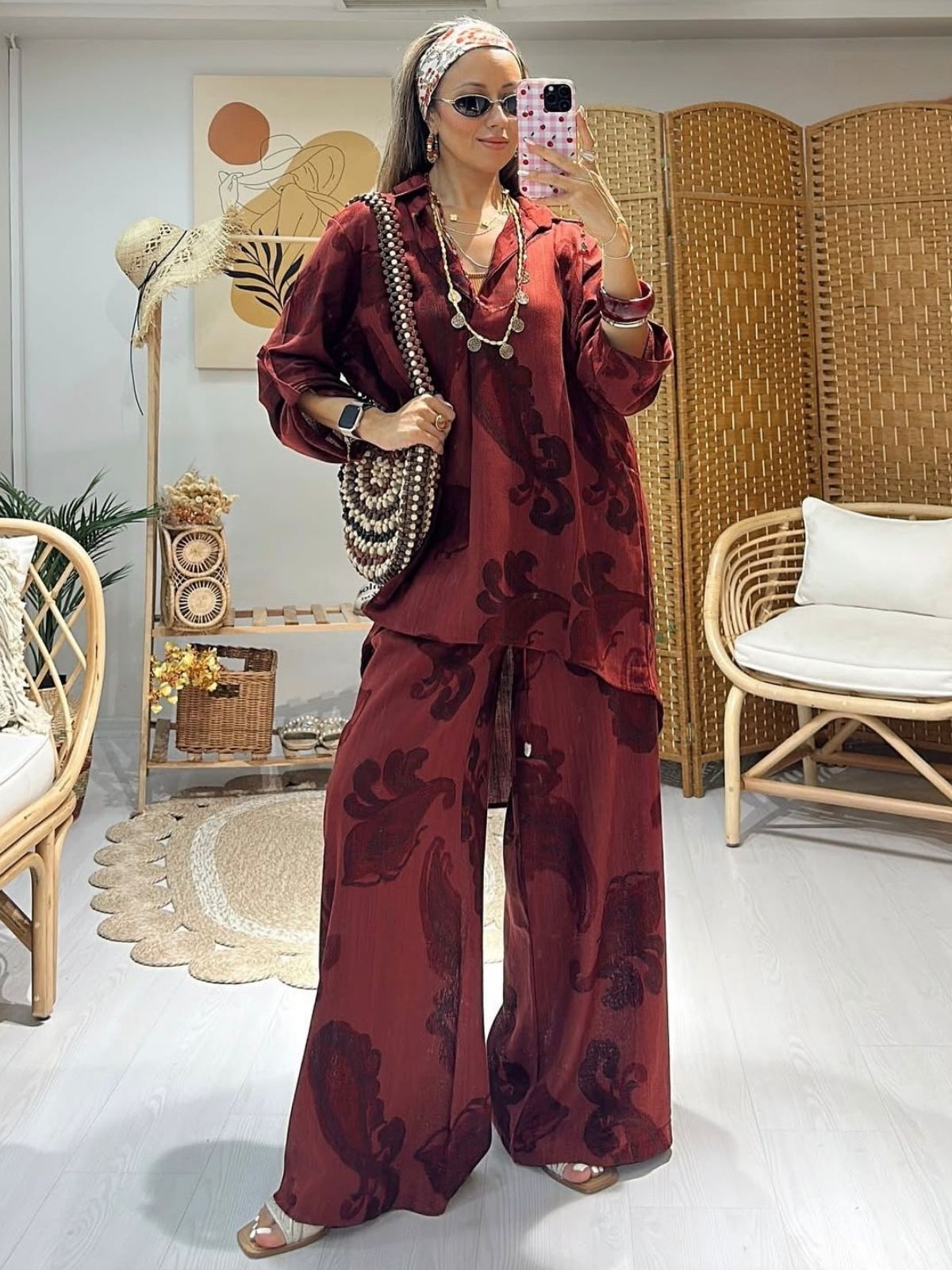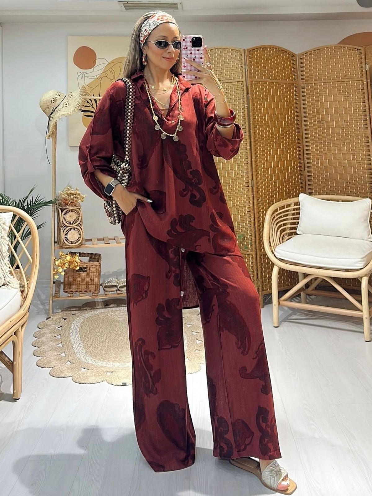 Bohem dokunuşlarla harmanlanmış modern bir duruş: Bu oversize takım, rahatlığın ve tarzın iddialı bir buluşması! Yumuşak ve hafif kumaşı sayesinde konforu gün boyu hissettirirken, geniş paçalı pantolonu ve dökümlü üstüyle özgür ve şık bir siluet sunuyor.