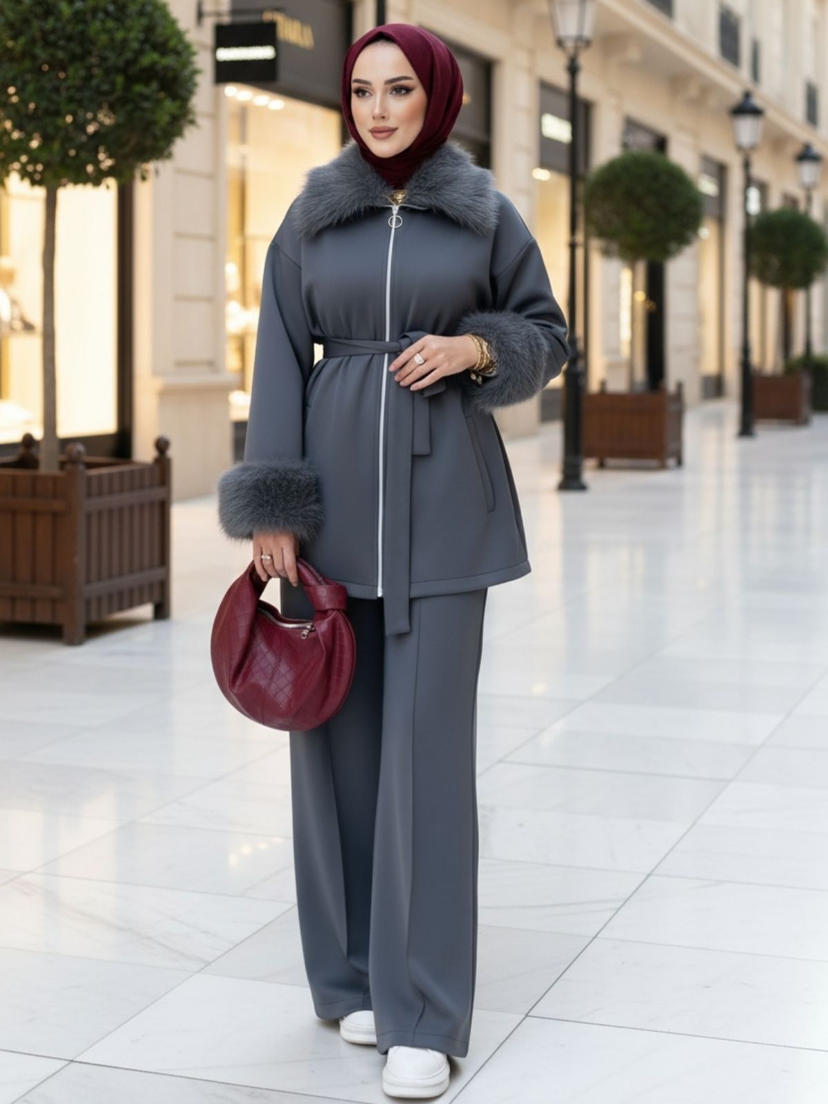 Şık ve modern tasarımıyla dikkat çeken bu takım, günlük kullanımda hem konforu hem de zarafeti bir arada sunuyor. Scuba kumaştan üretilmiş olup esnek, tok ve kırışmayan yapısıyla gün boyu rahat bir kullanım sağlar. Üst kısmı 75-77 cm uzunluğunda olup, belden bağlamalı kuşak detayı sayesinde vücut hatlarını zarifçe ortaya çıkarır. Gri tonlarındaki üst, fermuarlı kapanışı ve yaka ile kol uçlarındaki kürk detaylarıyla sofistike bir görünüm kazandırır. Alt kısmı 110 cm uzunluğunda, geniş paça kesimiyle modern bir siluet oluşturur.