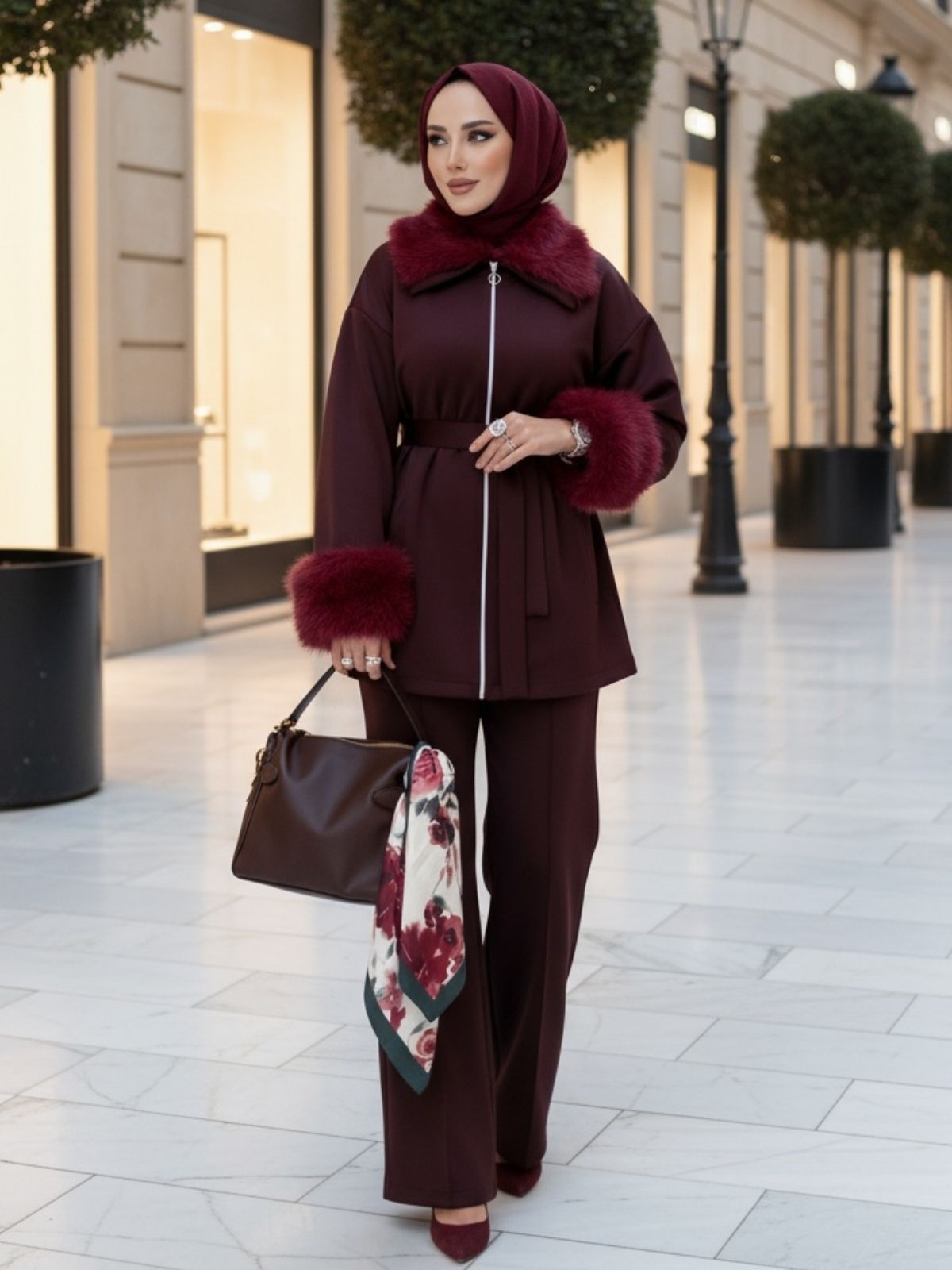Şık ve modern tasarımıyla dikkat çeken bu takım, günlük kullanımda hem konforu hem de zarafeti bir arada sunuyor. Scuba kumaştan üretilmiş olup esnek, tok ve kırışmayan yapısıyla gün boyu rahat bir kullanım sağlar. Üst kısmı 75-77 cm uzunluğunda olup, belden bağlamalı kuşak detayı sayesinde vücut hatlarını zarifçe ortaya çıkarır. Gri tonlarındaki üst, fermuarlı kapanışı ve yaka ile kol uçlarındaki kürk detaylarıyla sofistike bir görünüm kazandırır. Alt kısmı 110 cm uzunluğunda, geniş paça kesimiyle modern bir siluet oluşturur.