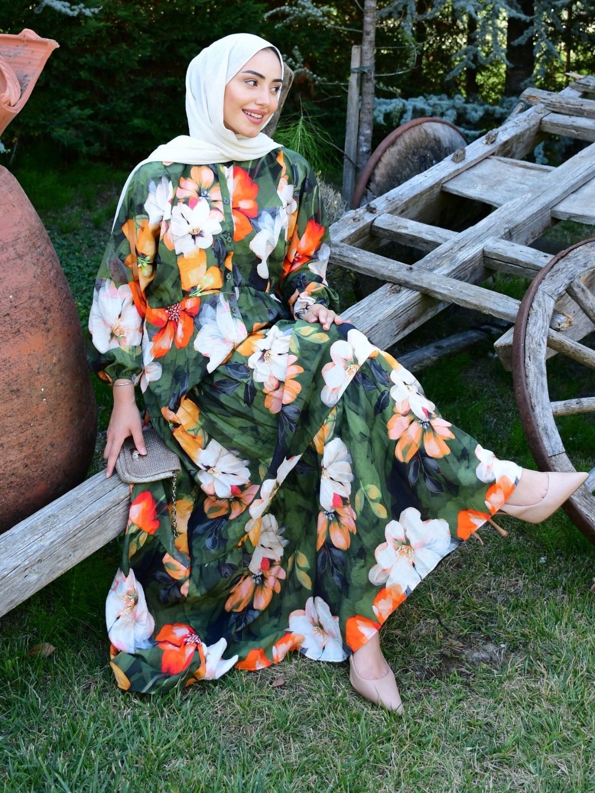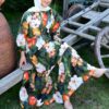 Büyük çiçek baskılarıyla romantik ve enerjik bir duruş yakalayan bu maxi elbise; zeytin yeşili zemin üzerinde mandalina turuncusu ve krem beyaz çiçeklerle tropik bir hava taşır. Rahat, dökümlü kesimi; kat kat büzgülü eteği ve bilekte lastikli kolları sayesinde gün boyu konfor sağlar. Düğmeli ön pat detayı pratik kullanım sunarken hafif dokusu yaz davetlerinden hafta sonu buluşmalarına kadar her ana eşlik eder. Nude topuklular ve açık ton şallarla zarif, renkli aksesuarlarla ise daha iddialı kombinler oluşturabilirsiniz
