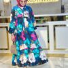 Aynı romantik büyük çiçek deseni bu kez serin bir mavi paletle yeniden yorumlandı. Derin lacivert zemin üzerinde buz mavisi ve camgöbeği geçişli yapraklar, krem beyaz çiçeklerle kontrast oluşturuyor. Kat kat büzgülü eteği, rahat kesimi ve bilekte lastikli kollarıyla gün boyu konfor sunan elbise; düğmeli ön pat detayıyla pratik bir kullanım sağlıyor. Nude topuklularla zarif, gümüş aksesuarlarla daha modern bir görünüm elde edebilirsiniz. İstersen alternatif isim/renk seçenekleri de üretebilirim