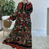 Baharatlı turuncu (cayenne), zümrüt yaprak yeşili, ten/nude ve beyaz lekeleri siyah konturlarla birleşiyor; grafiti fırça darbeli desen elbiseye modern tropik enerji katıyor. Rahat oversize kalıp, kontrast siyah patlı/V yaka hattı ve bilekte lastikli balon kollarla hem ferah hem iddialı. Kat kat dökümlü etek adım attıkça hareket eder; nötr şallar (krem, ekru) ve hasır çantalarla tamamlandığında şehirden sahile geçiş yapmaya hazır bir stil sunar.