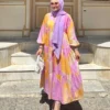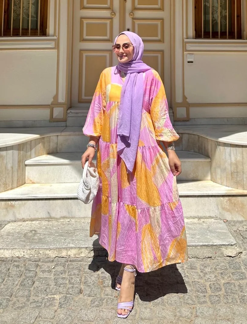 Günbatımı Tropik Elbise, palmiyelerin arasından süzülen serin rüzgârı ve gökyüzünde eriyen pembe-turuncu tonlarını stiline taşıyor. Krepon efektli hafif pamuk-viskon kumaşı sayesinde nefes alır, terletmez. Canlı mango turuncusu ve hibiskus pembesi dalgalar hâlindeki desen, hareket ettikçe akvarel bir günbatımı hissi verir.