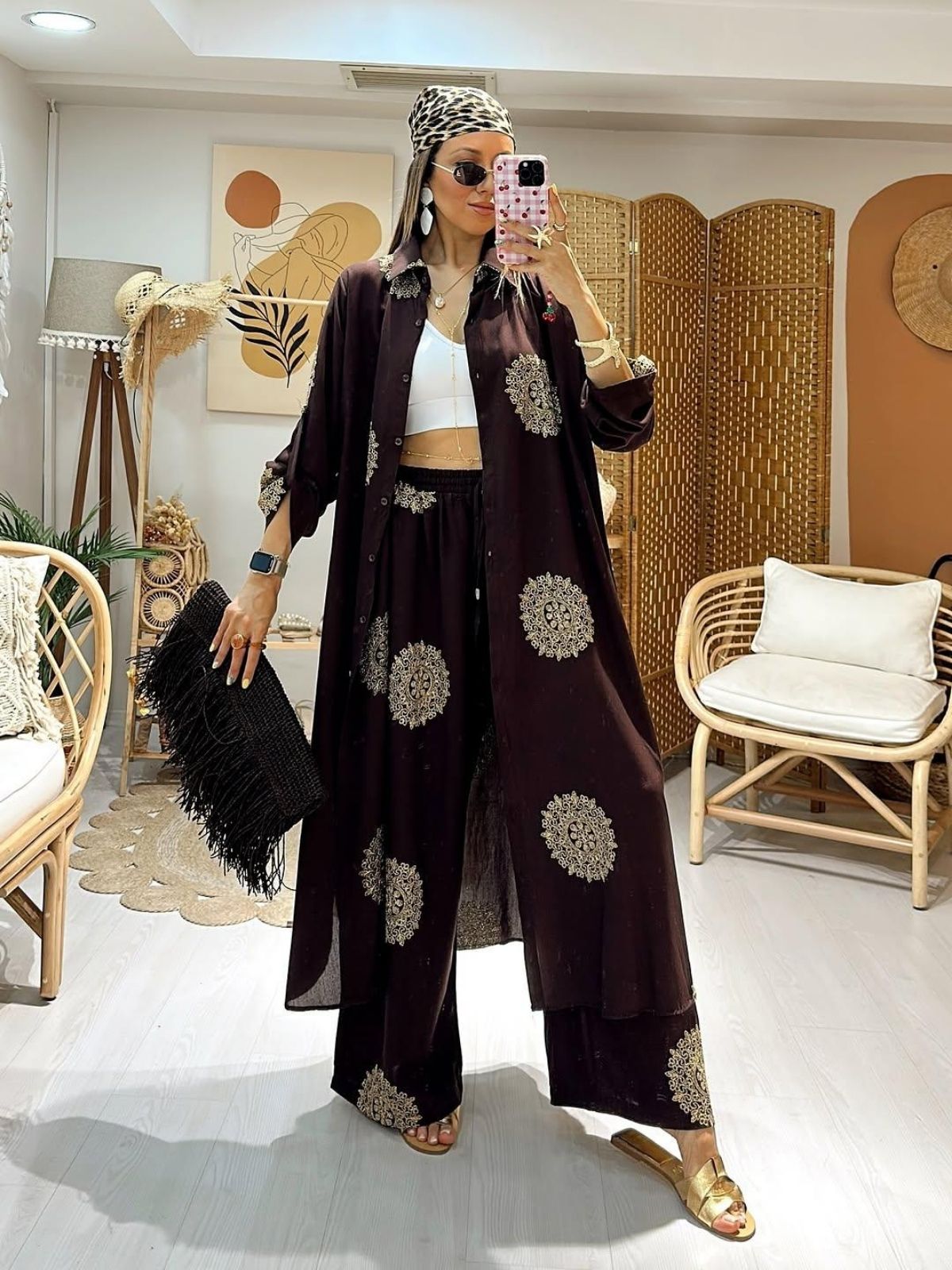 Yazın serin akşamlarına ve tatil kaçamaklarına eşlik edecek rahat–şıklık: dökümlü oversize gömlek/kimonosu ve bol paça lastikli beliyle ultra konforlu pantolondan oluşan iki parçalı takım. Doğal görünümlü hafif kumaş üzerine yerleştirilen yumuşak altın tonlu mandala baskılar bohem bir zarafet katıyor. Uzun boylu üst parça ister açık kimono, ister düğmeli gömlek olarak kullanılabilir; crop top, mayo ya da basic tişörtlerle kolayca kombinlenir. Plaj çantası, hasır aksesuarlar ve katmanlı takılarla tamamlayarak effortless resort stilini yakalayın.