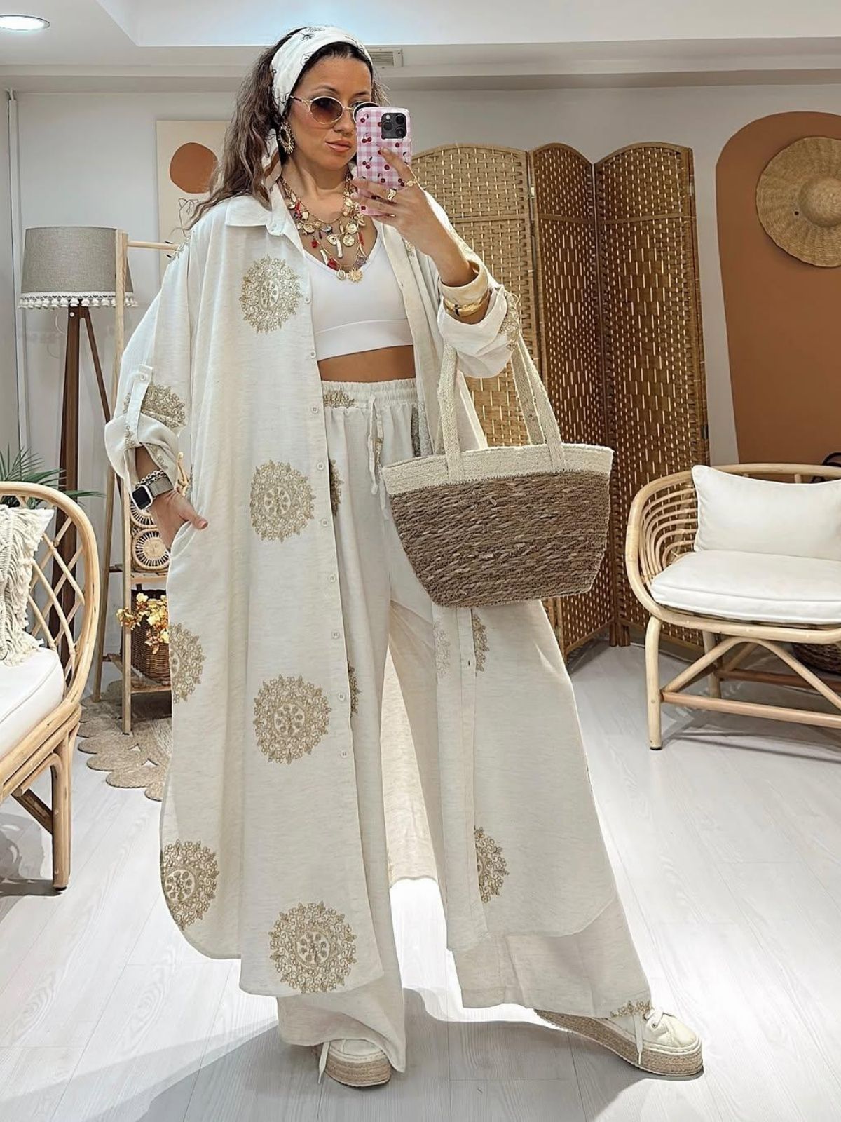 Yazın serin akşamlarına ve tatil kaçamaklarına eşlik edecek rahat–şıklık: dökümlü oversize gömlek/kimonosu ve bol paça lastikli beliyle ultra konforlu pantolondan oluşan iki parçalı takım. Doğal görünümlü hafif kumaş üzerine yerleştirilen yumuşak altın tonlu mandala baskılar bohem bir zarafet katıyor. Uzun boylu üst parça ister açık kimono, ister düğmeli gömlek olarak kullanılabilir; crop top, mayo ya da basic tişörtlerle kolayca kombinlenir. Plaj çantası, hasır aksesuarlar ve katmanlı takılarla tamamlayarak effortless resort stilini yakalayın.