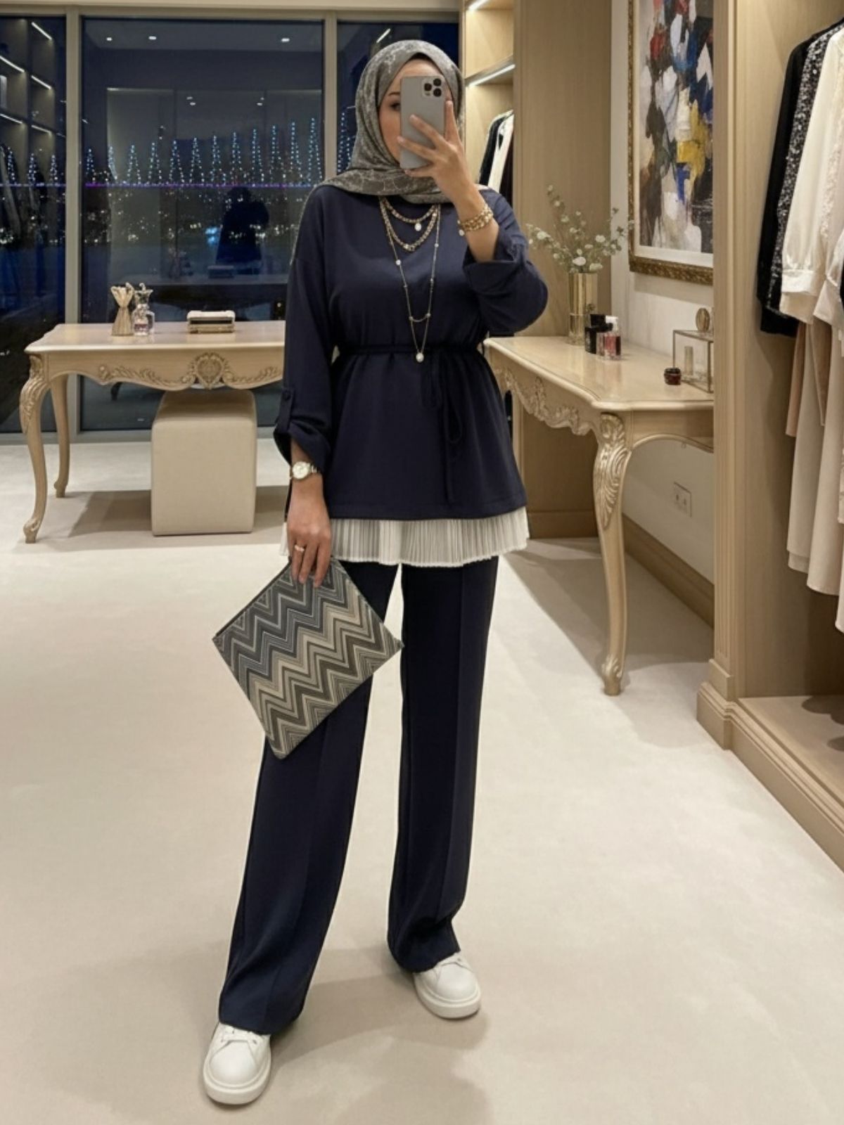 Hem günlük şıklıkta hem özel davetlerde rahatlıkla tercih edilebilecek bu takım, modern zarafeti geleneksel dokunuşlarla buluşturuyor.
