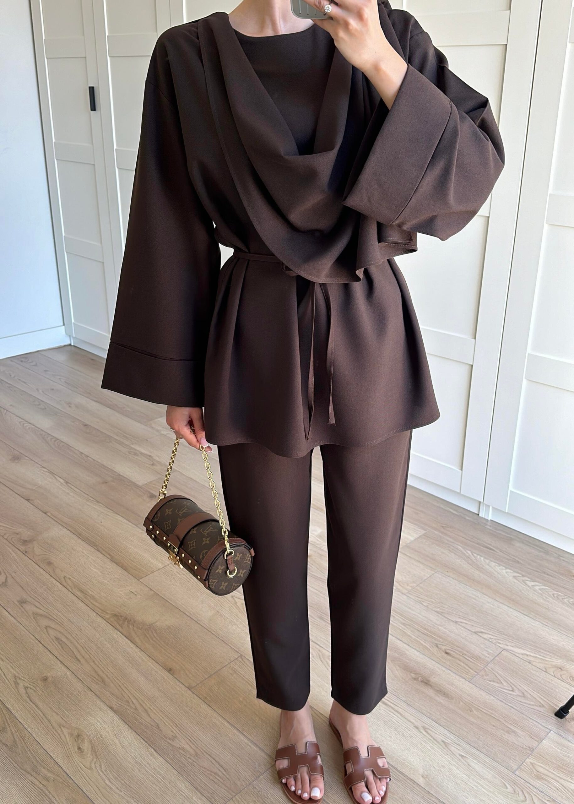 Hem günlük şıklıkta hem özel davetlerde rahatlıkla tercih edilebilecek bu takım, modern zarafeti geleneksel dokunuşlarla buluşturuyor.