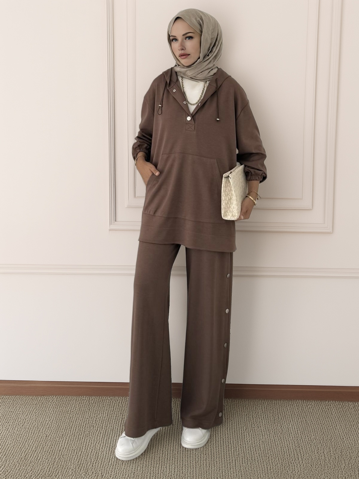 Hem günlük şıklıkta hem özel davetlerde rahatlıkla tercih edilebilecek bu takım, modern zarafeti geleneksel dokunuşlarla buluşturuyor.