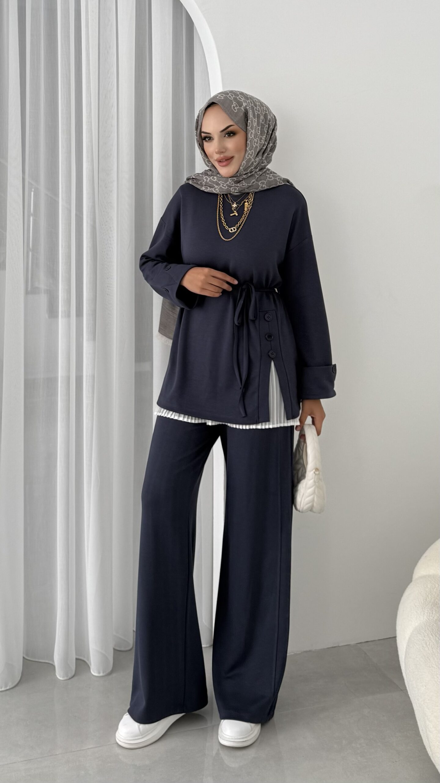 Hem günlük şıklıkta hem özel davetlerde rahatlıkla tercih edilebilecek bu takım, modern zarafeti geleneksel dokunuşlarla buluşturuyor.