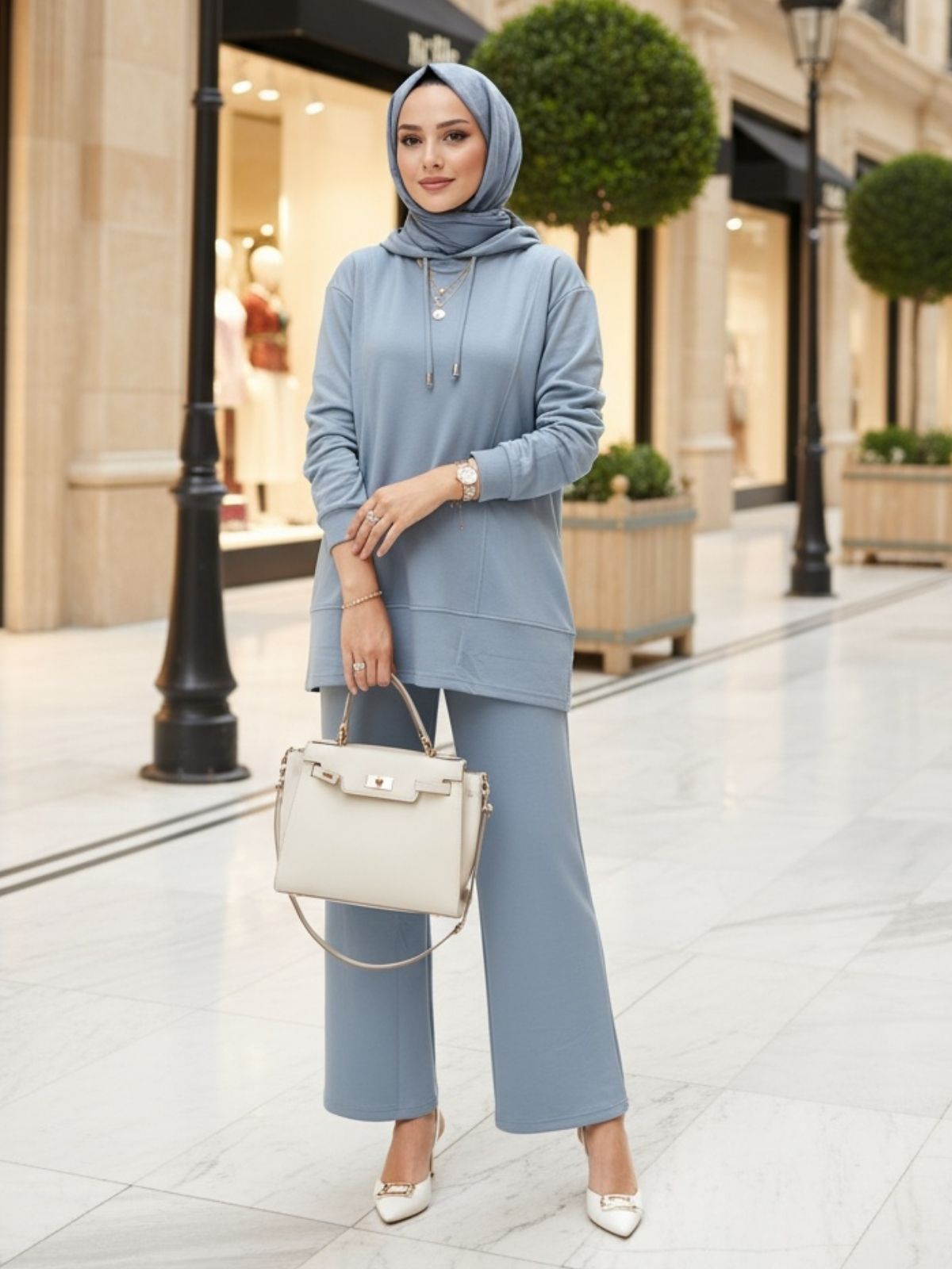 Tesettür giyime uygun düşünülmüş uzunluk ve form anlayışı, hem iş temposunda hem de günlük şehir stilinde düzenli ve toparlanmış bir görünüm sunmayı amaçlar.