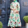 Doğanın tazeliğini yansıtan yeşil tonlar, krem zemin ve narin kırmızı vurgularla buluşarak bu elbisede su renkleri etkisi yaratıyor. Hafif ve dökümlü yapısı sayesinde sıcak yaz günlerinde konforlu kullanım sunarken, canlı renk uyumuyla dikkat çeken bir şıklık sağlıyor. Hem günlük kullanım hem de özel davetlerde tercih edilebilecek çok yönlü bir parça. Nötr çantalar ve sade aksesuarlarla kolayca kombinlenebilir.