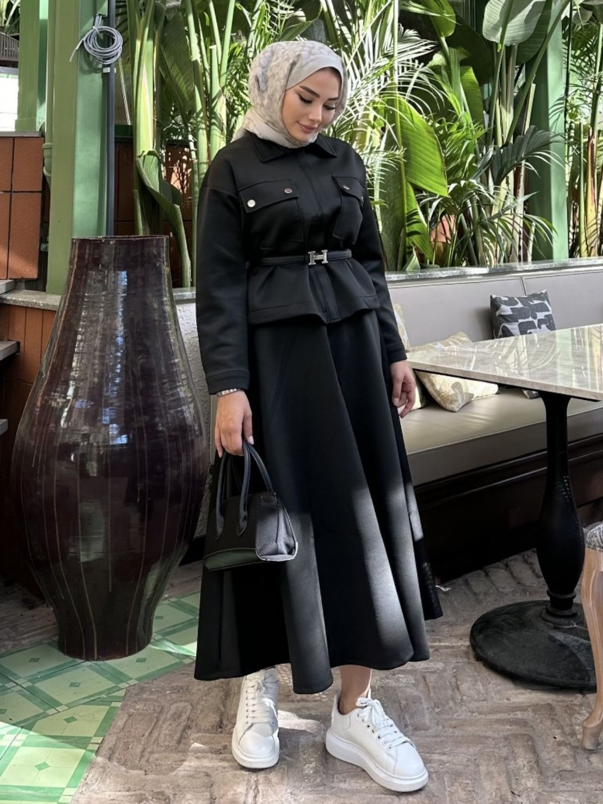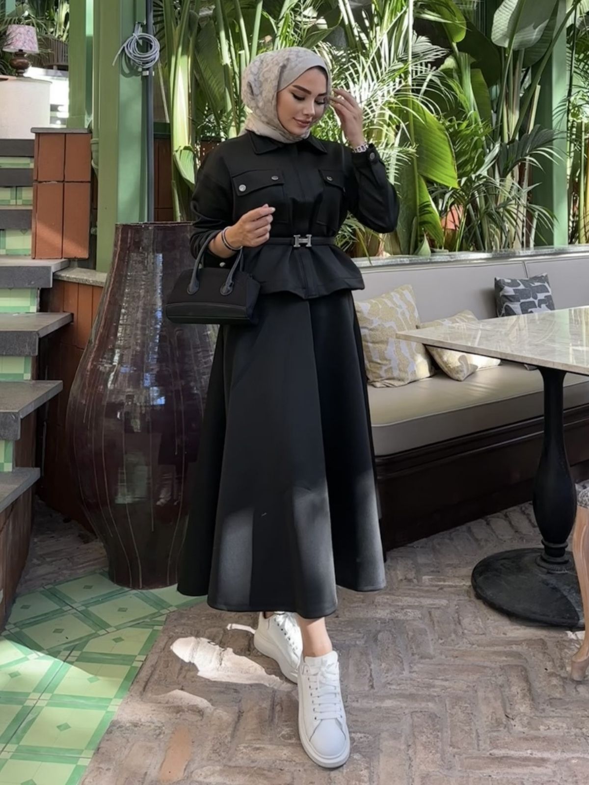 Siyahın asaletini modern bir dokunuşla birleştiren bu scuba etekli takım ile stilinizi konuşturun. Bel vurgulu ceket ve kloş etek kesimi sayesinde hem şık hem de rahat bir görünüm elde edin. Spor ayakkabı ile kombinleyerek havalı, dinamik bir tarz yakalayın!