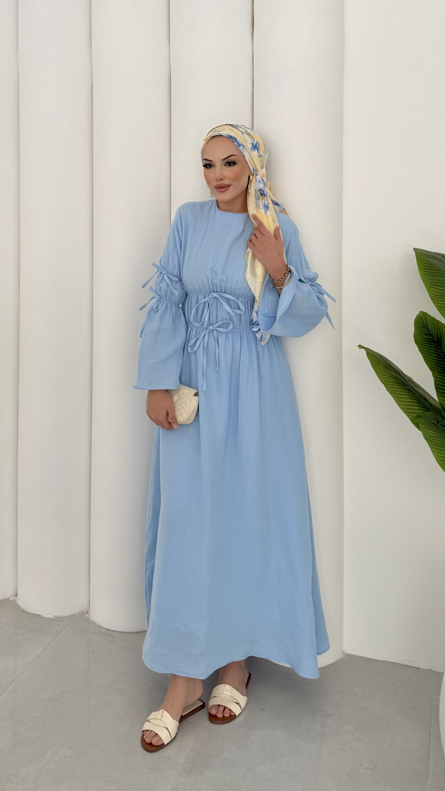 Pamuklu müslinin nefes alan hafifliği ile ketenin doğal dokusunu bir araya getiren    , yaz günlerine layık tatlı bir serinlik sunar. Hareket ettikçe dalgalanarak güneş ışığını elbisenizin her kıvrımında yakalar.
