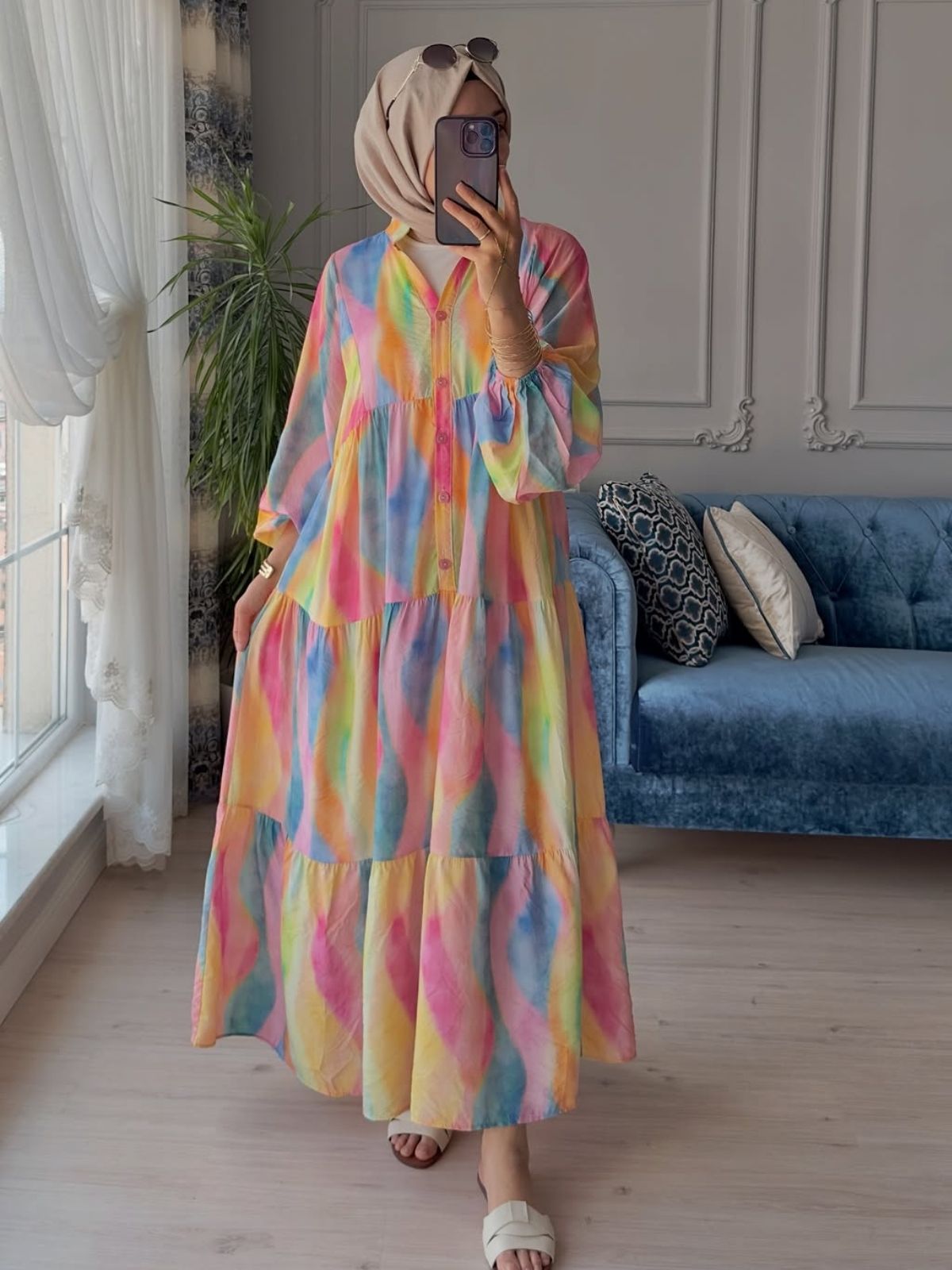 Canlı renklerin dalgalı desenlerle harmanlandığı bu elbise, pembe, sarı, mavi ve yeşilin uyumlu geçişleriyle enerjik bir yaz görünümü sunuyor. Hafif dokusu ve dökümlü kesimi sayesinde sıcak havalarda rahatlık sağlarken, hareketli deseniyle hem günlük kombinlerde hem de tatil stilinde dikkat çekici bir parça oluyor. Nötr şallar ve sade aksesuarlarla dengelenerek kolayca tamamlanabilir.
