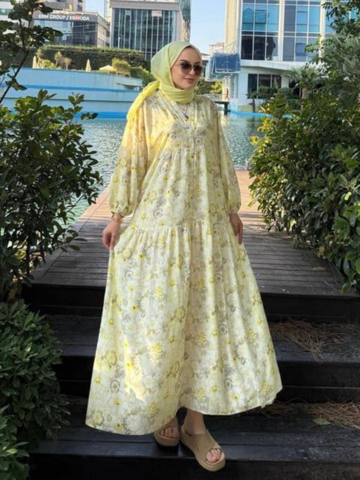 Sabah güneşiyle açan mimoza dallarını andıran soft sarı çiçek baskısıyla ferah, romantik bir yaz şıklığı sunar. Hafif dökümlü dokusu ve katlı (tiered) maxi formu yürüdükçe uçuşur; önden düğmeli tasarım pratik giy-çık rahatlığı sağlar. Bilekte toparlanan balon kollar feminen ve konforlu. Açık bej / krem şal, hasır çanta ve beyaz ayakkabılarla kombinlendiğinde doğal, fotojenik bir yaz görünümü elde edersin—günlük şehir gezilerinden tatil kahvaltılarına ve açık hava davetlerine kadar çok yönlü kullan.