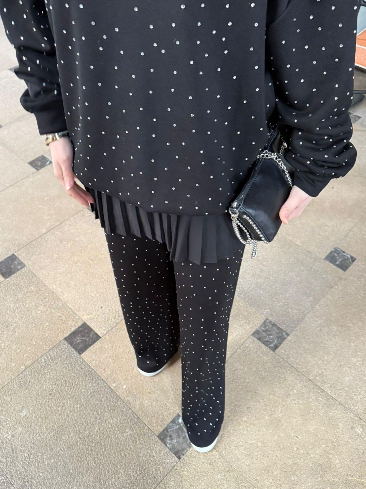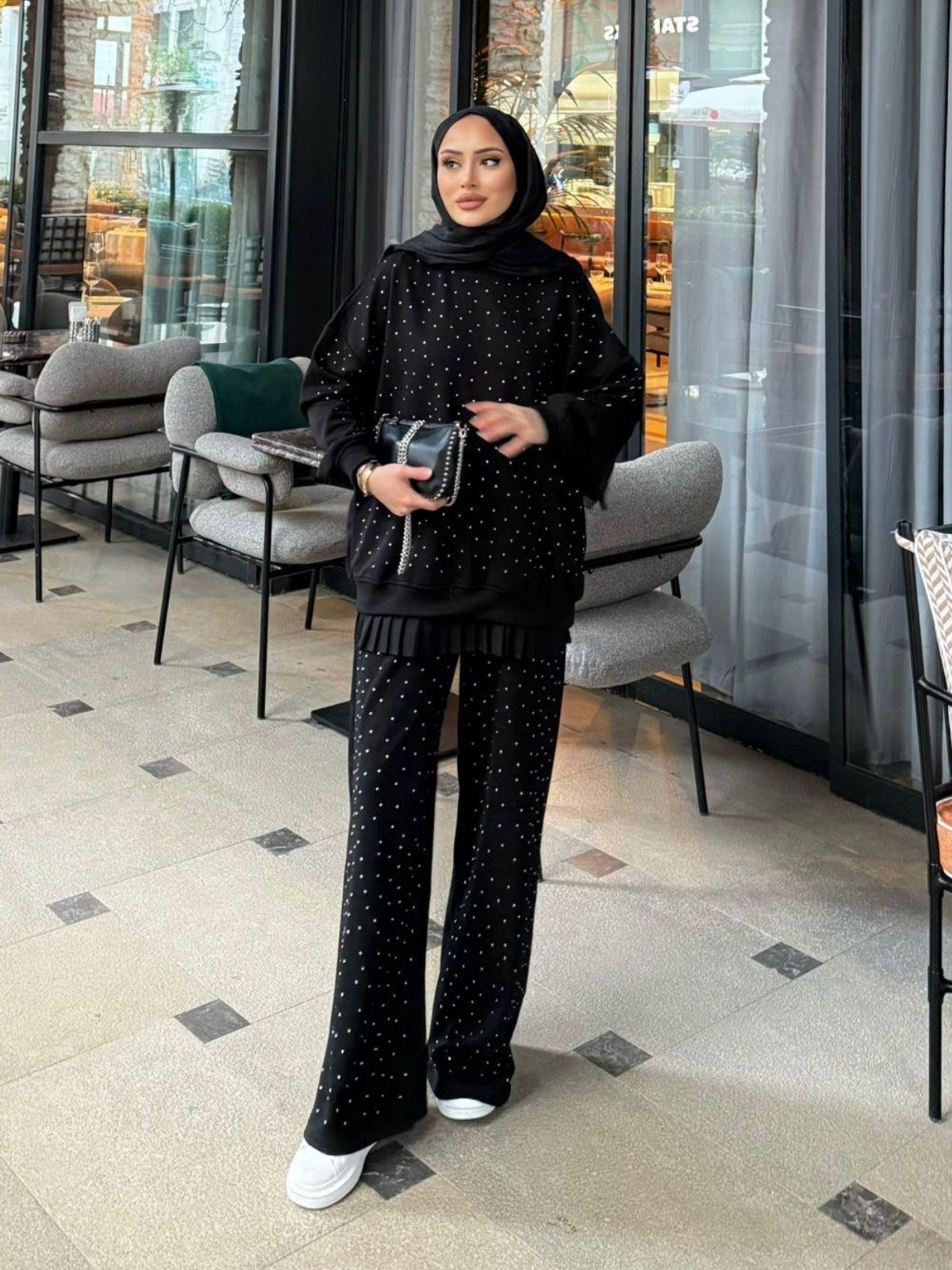 Konfor ve lüksün birleşimi! Bu siyah, taş detaylı ikili takım ile günlük şıklığınızı bir üst seviyeye taşıyın.