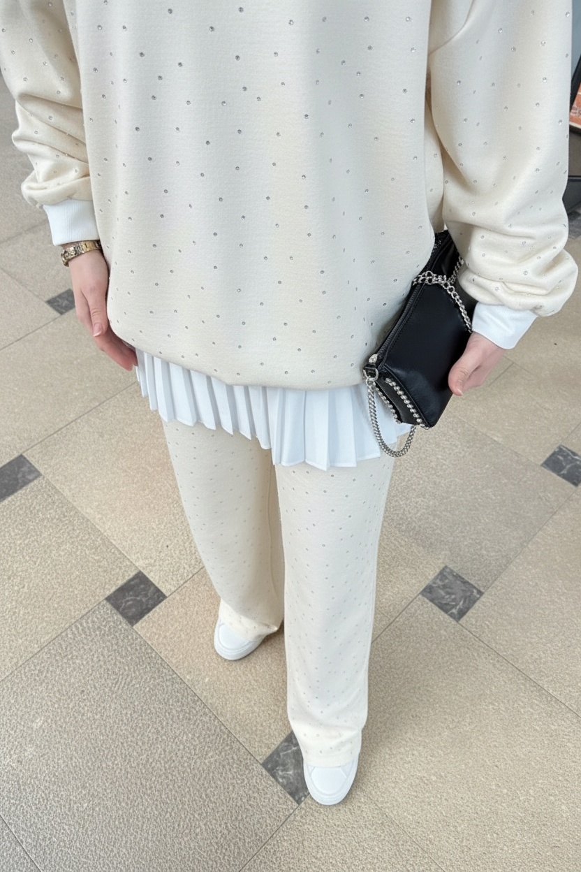 • Üst Parça: Yumuşak ve rahat kumaştan üretilmiş, omuzlardan alta kadar parlak taşlarla bezenmiş salaş kesim sweatshirt. (Alt kısımda pilili/katmanlı etek detayı ile hareketlilik sağlanmıştır.)