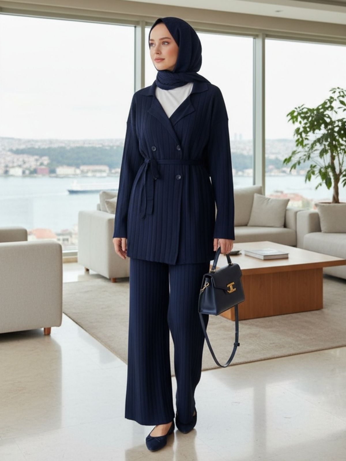Triko şıklığını modern bir yorumla buluşturan bu takım ile sofistike bir stil yaratın. Şerit dokulu kumaşı, kruvaze kesimli ceket ve bol paça pantolonuyla hem ofiste hem de özel davetlerde zahmetsiz şıklık sunar. Kemer detayı ile belinizi vurgulayın, konforlu kumaşın keyfini çıkarın.