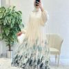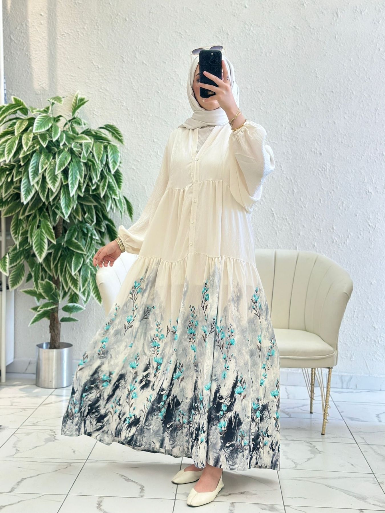 Romantik ve modern çizgiyi aynı anda taşıyan bu maxi elbise; dökümlü kırık beyaz gövdesi, rahat kesimli balon kolları ve katmanlı etek yapısıyla hareket ettikçe zarif bir akış sunar. Etek ucuna doğru yoğunlaşan duman-gri akvarel geçişler arasından yükselen turkuaz çiçek dalları tasarıma sanatsal bir hava katar.