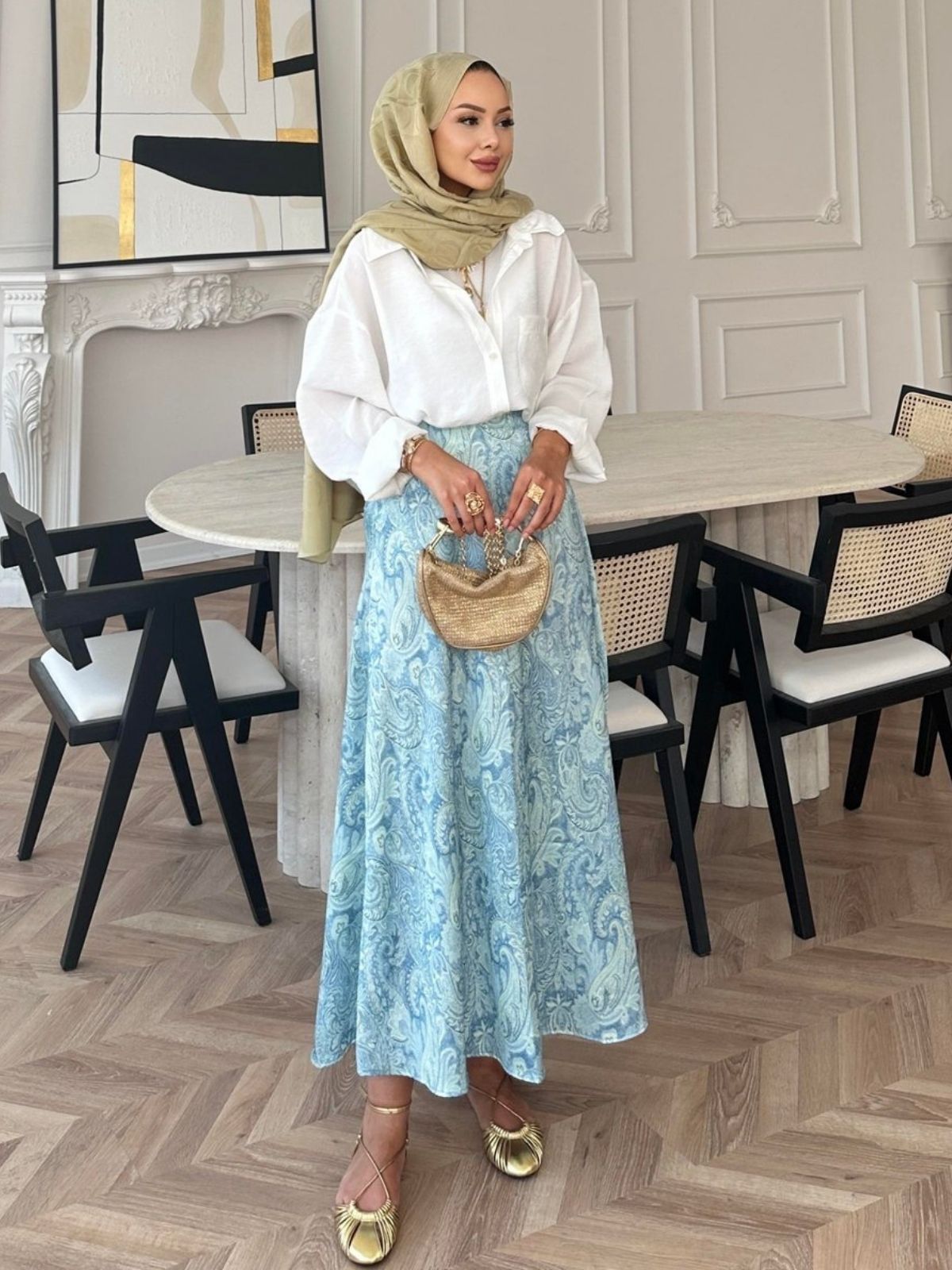 Desenli tasarımı ve dökümlü yapısıyla hem günlük hem de özel gün kombinlerine uyum sağlayan uzun etek modeli. Hafif ve rahat kumaşı sayesinde gün boyu konfor sunar. Yüksek bel kesimi ve akışkan formu ile şık bir siluet oluşturur, farklı üstlerle kolayca kombinlenebilir.