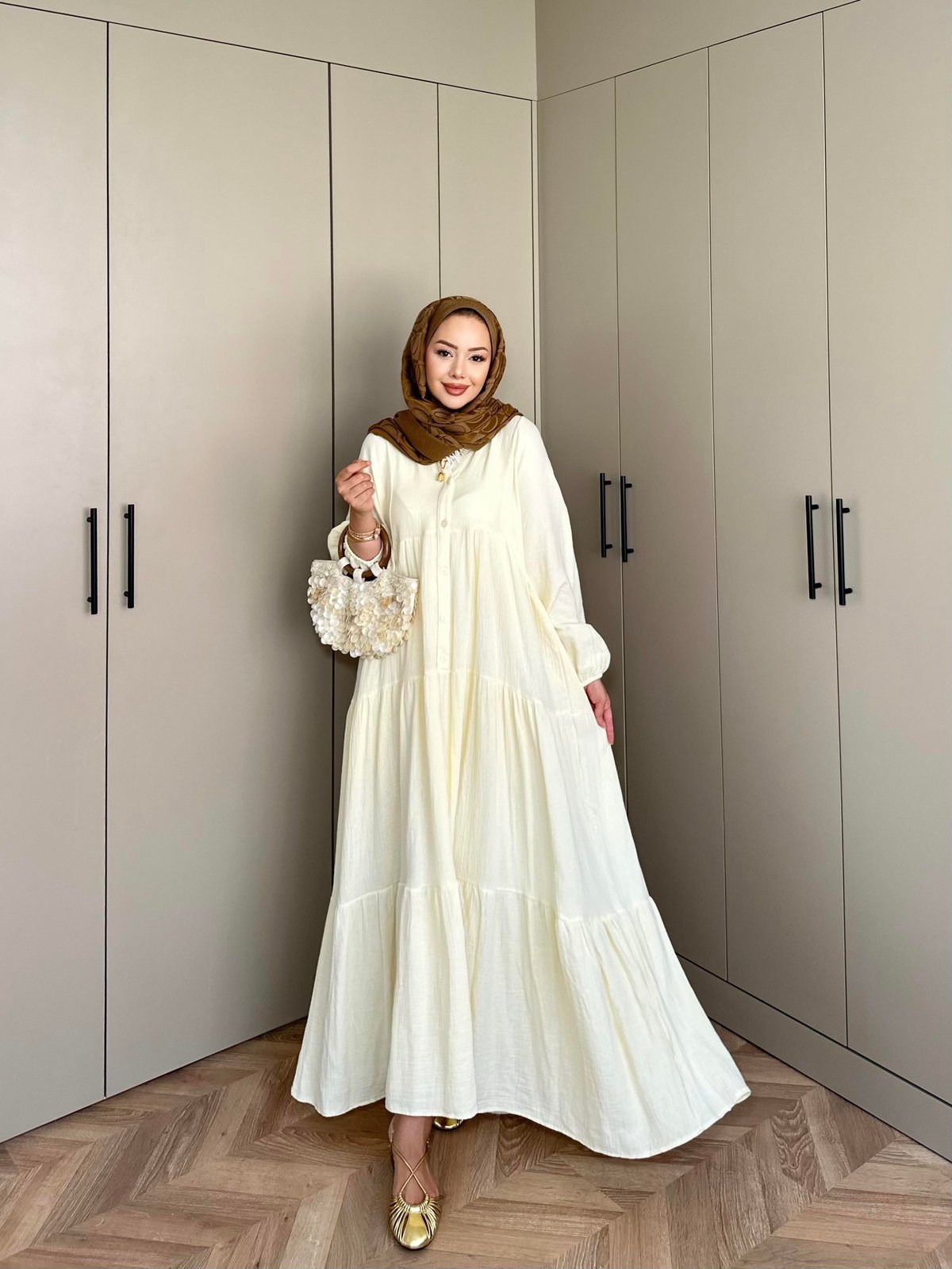 Pamuklu müslinin nefes alan hafifliği ile ketenin doğal dokusunu bir araya getiren    , yaz günlerine layık tatlı bir serinlik sunar. Hareket ettikçe dalgalanarak güneş ışığını elbisenizin her kıvrımında yakalar.