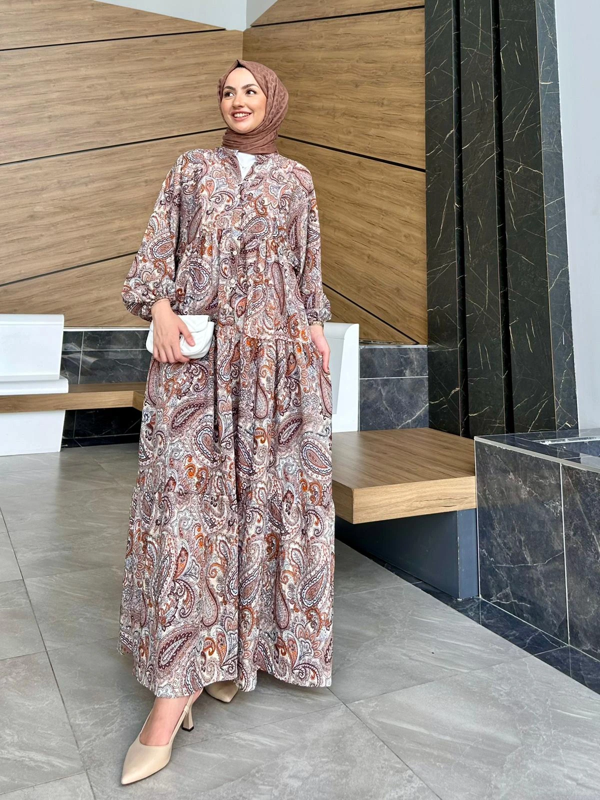 Yumuşacık viskon dokusuyla dökümlü duran bu bohem paisley elbise, kiremit‑tarçın ve toprak tonlarının ince krem şal ile yakaladığı huzurlu uyumla modern şehir şıklığını zahmetsizce tamamlıyor. Bilekte lastikli balon kollar hareketli bir siluet sunarken, doğal hasır saplı çanta ve dantel fiyonk detayı kombine sıcak bir yaz dokunuşu katıyor. Gün boyu konfor, hafta sonu gezmelerinden davetlere tek parçada stil vaadi!