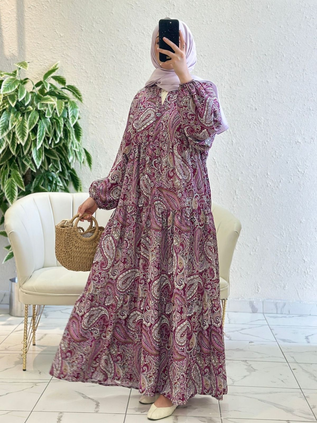 Yumuşacık viskon dokusuyla dökümlü duran bu bohem paisley elbise, kiremit‑tarçın ve toprak tonlarının ince krem şal ile yakaladığı huzurlu uyumla modern şehir şıklığını zahmetsizce tamamlıyor. Bilekte lastikli balon kollar hareketli bir siluet sunarken, doğal hasır saplı çanta ve dantel fiyonk detayı kombine sıcak bir yaz dokunuşu katıyor. Gün boyu konfor, hafta sonu gezmelerinden davetlere tek parçada stil vaadi!