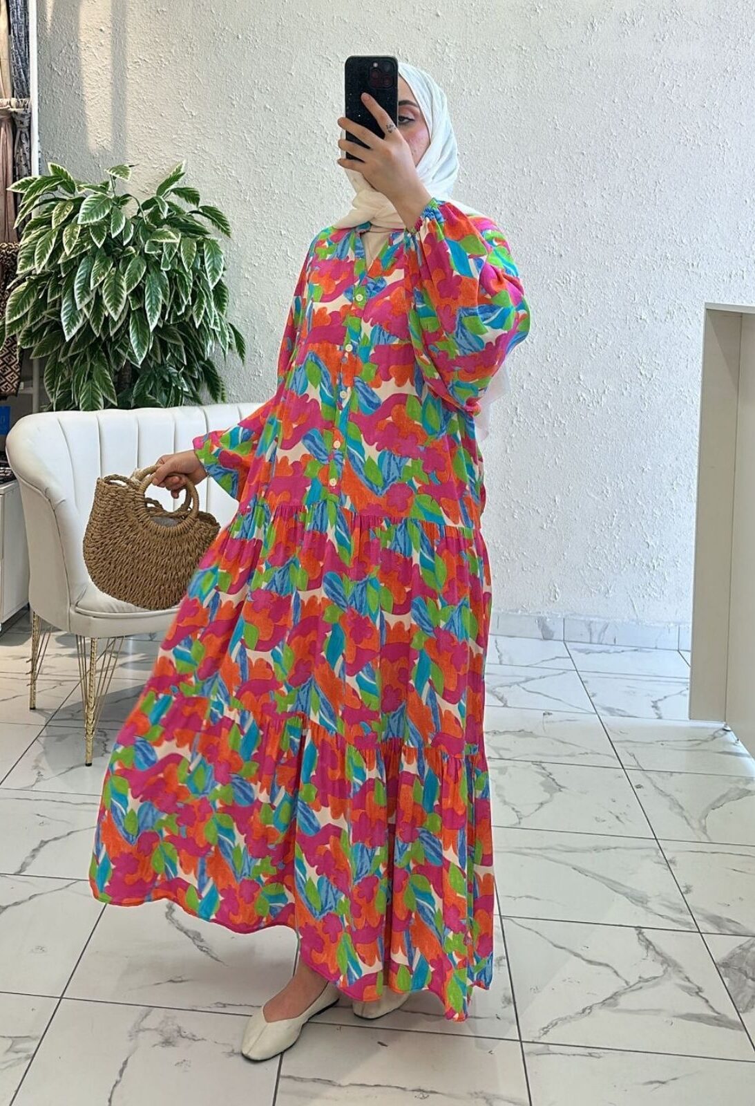 Şeker renklerinin dansı! Fuşya, mandalina turuncu, canlı yeşil, mavi ve mor fırça-çiçek desenleriyle capcanlı maxi elbise. Rahat oversize kalıp, önden düğmeli gömlek formu ve kat kat volanlı etek hareket ettikçe uçuşur. Bilekte lastikli hafif balon kollar yaz rüzgârını içeri alır. Hasır çanta ve nötr şal ile anında tatil stili.