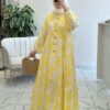 Kırık beyaz zemin üzerinde limon sarısı fırça‑çiçek desenleriyle yazın enerjisini taşıyan kat kat, ferah oversize elbise. Hafif ve nefes alan dokulu kumaş gün boyu konfor sağlar; yarım düğmeli yuvarlak yaka pratik giy‑çıkar kolaylığı sunar. Bilekte lastikli balon kollar ve geniş kloş etek hareketli, romantik bir siluet verir. Şal, hasır çanta ve sandaletlerle gündüzden akşama zahmetsiz şıklık.
