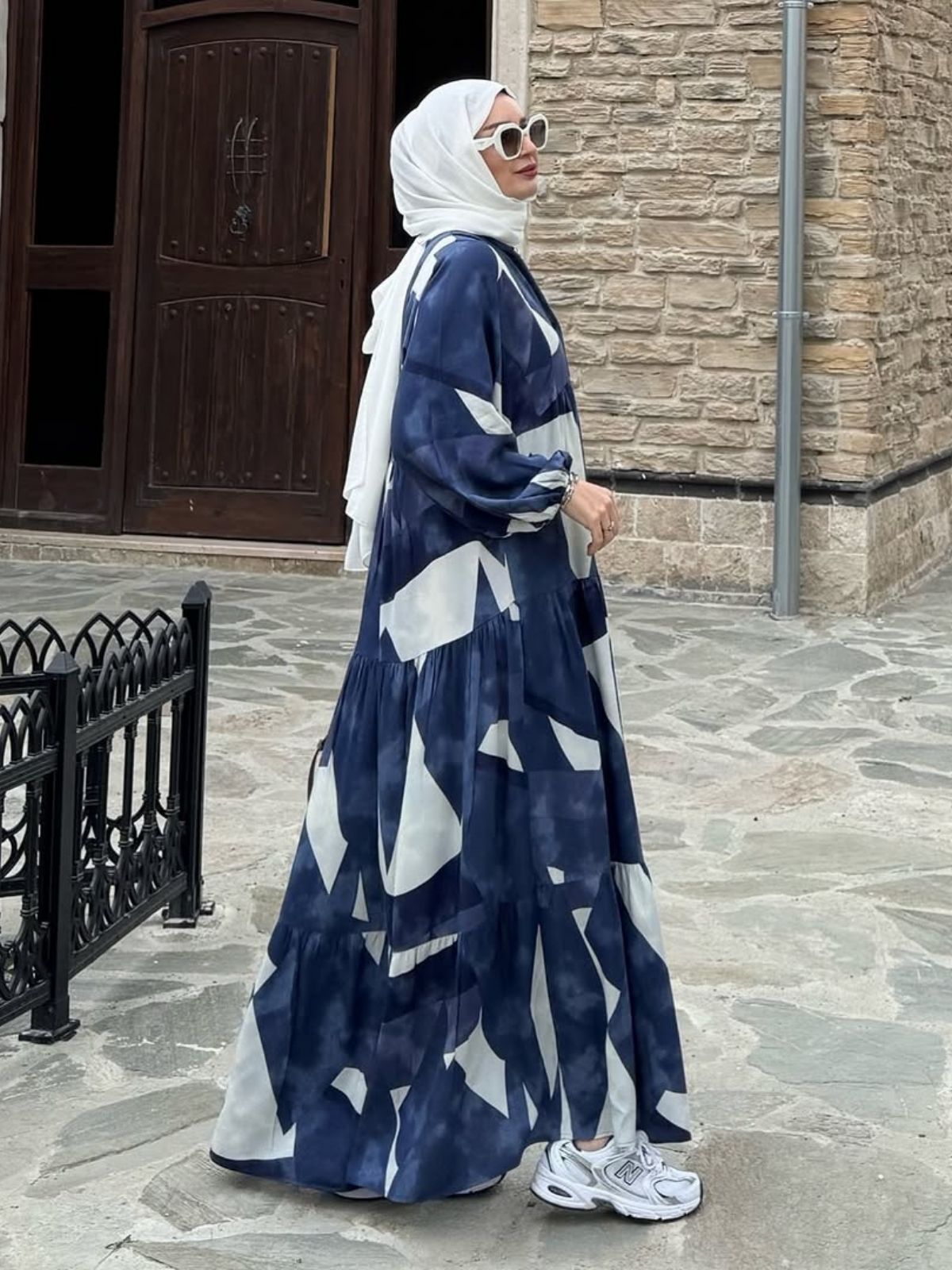 Büyük geometrik bloklarla hareketlenen bu dökümlü elbise, lacivert ve kırık beyazın kontrastıyla modern bir grafik etki yaratır. V yakaya inen düğmeli pat, kat kat büzgülü eteği ve bilekte lastikli geniş kollarıyla hem rahat hem şık bir siluet sunar. Hafif, akışkan kumaşı sayesinde gün boyu serin ve konforlu hissettirir; sneaker’la şehirde, sandaletle tatilde kolayca kombinlenir.