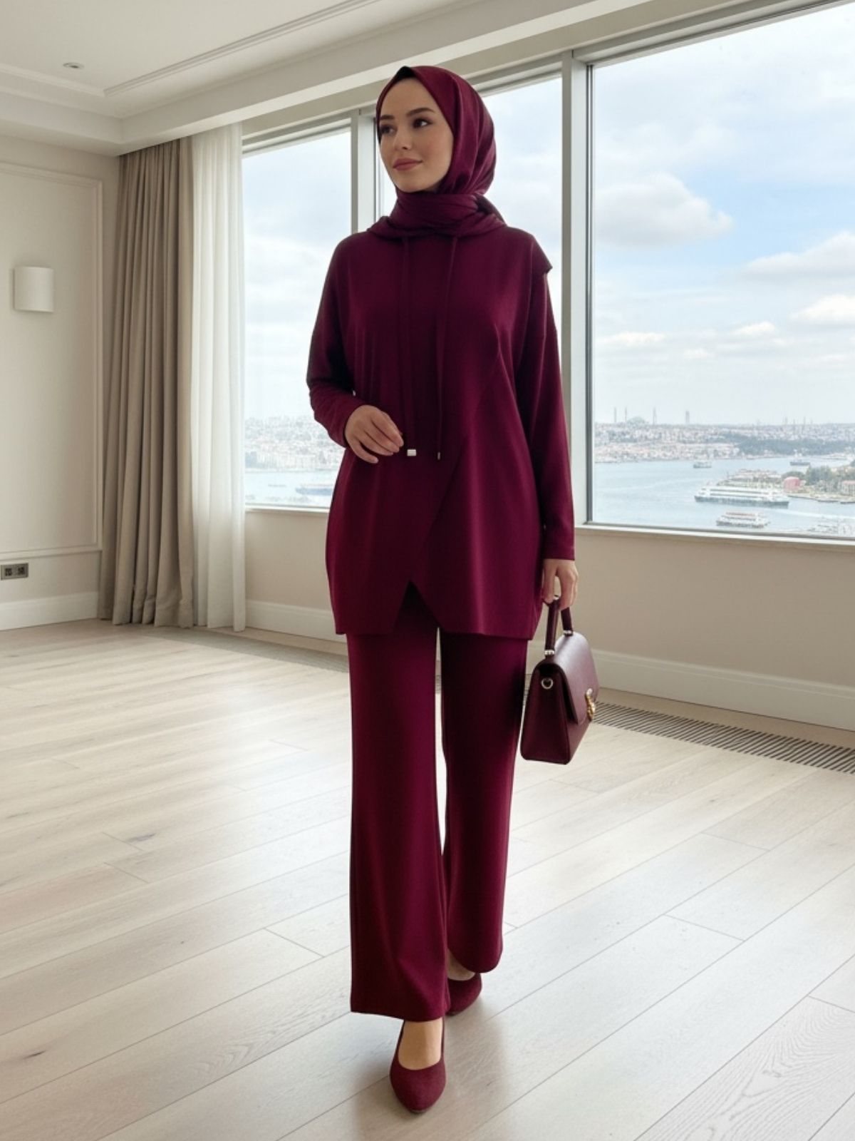 Hem günlük şıklıkta hem özel davetlerde rahatlıkla tercih edilebilecek bu takım, modern zarafeti geleneksel dokunuşlarla buluşturuyor.