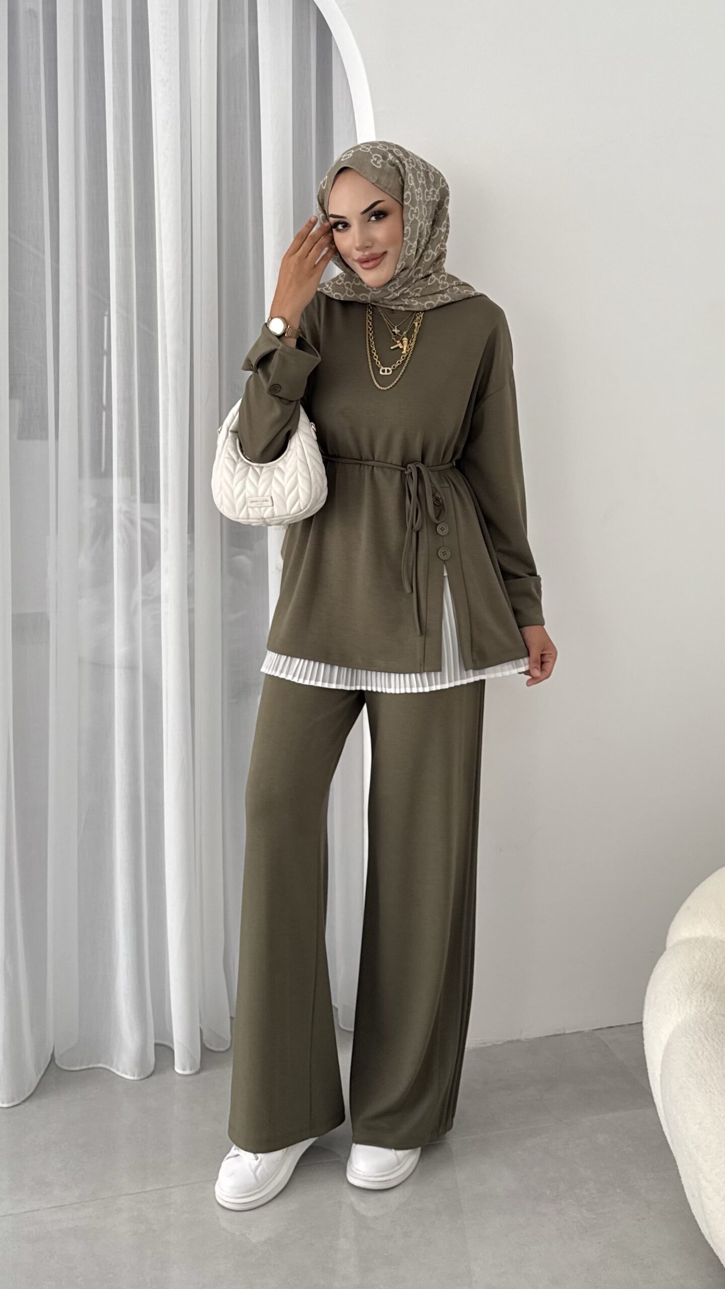 Hem günlük şıklıkta hem özel davetlerde rahatlıkla tercih edilebilecek bu takım, modern zarafeti geleneksel dokunuşlarla buluşturuyor.