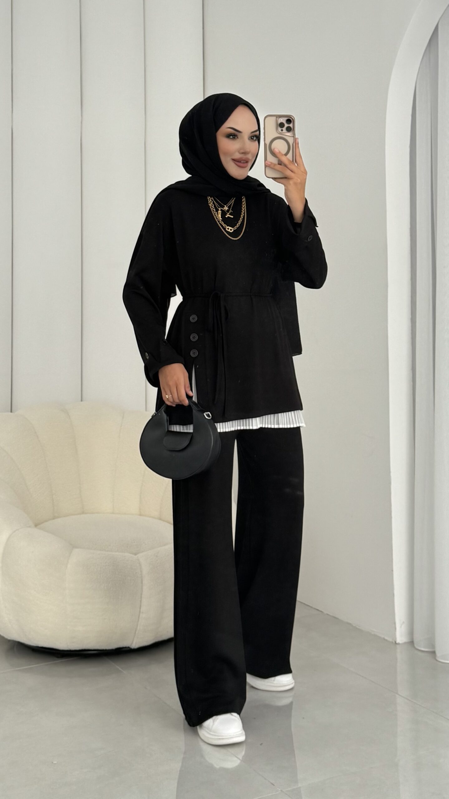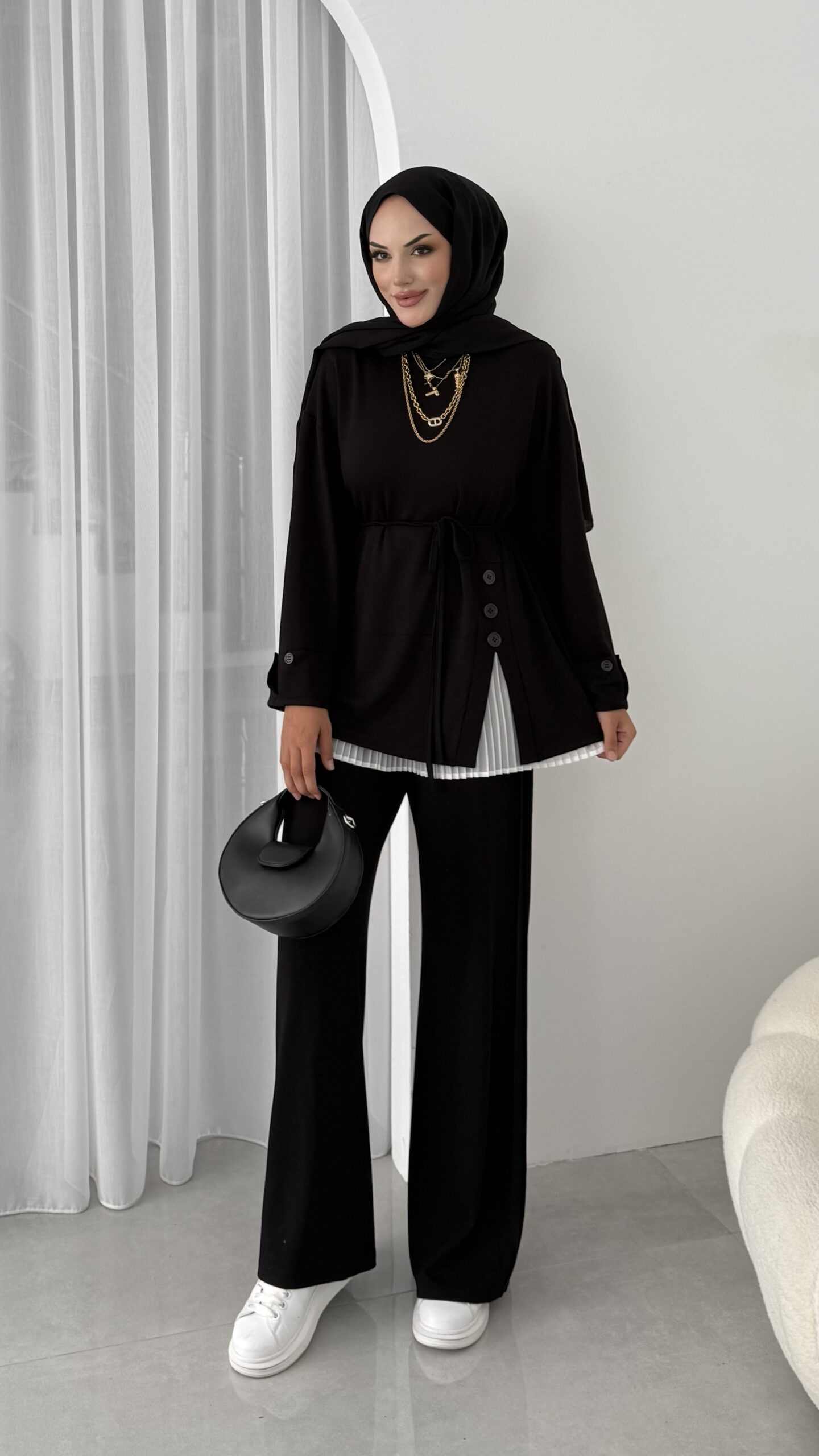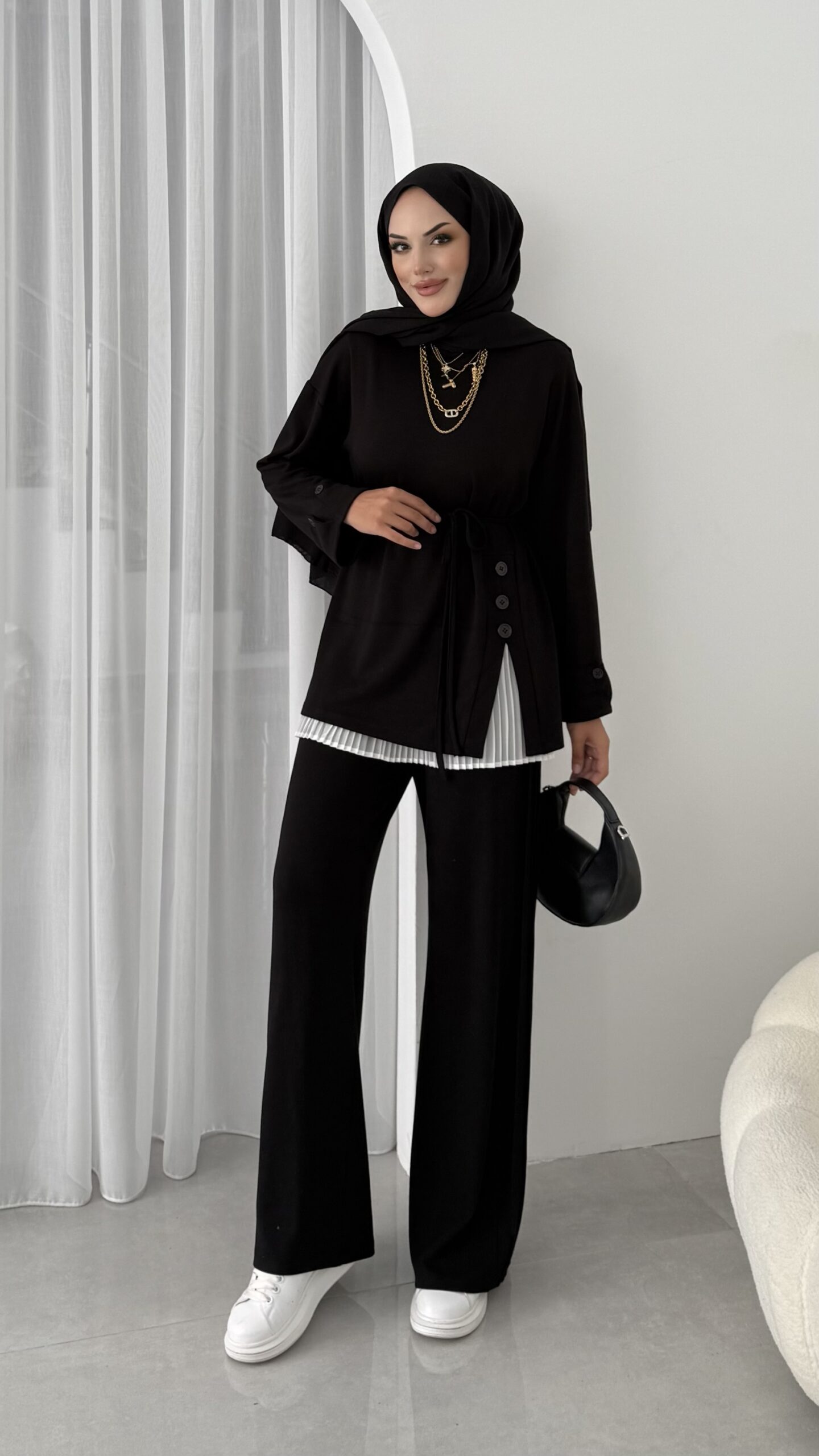 Hem günlük şıklıkta hem özel davetlerde rahatlıkla tercih edilebilecek bu takım, modern zarafeti geleneksel dokunuşlarla buluşturuyor.