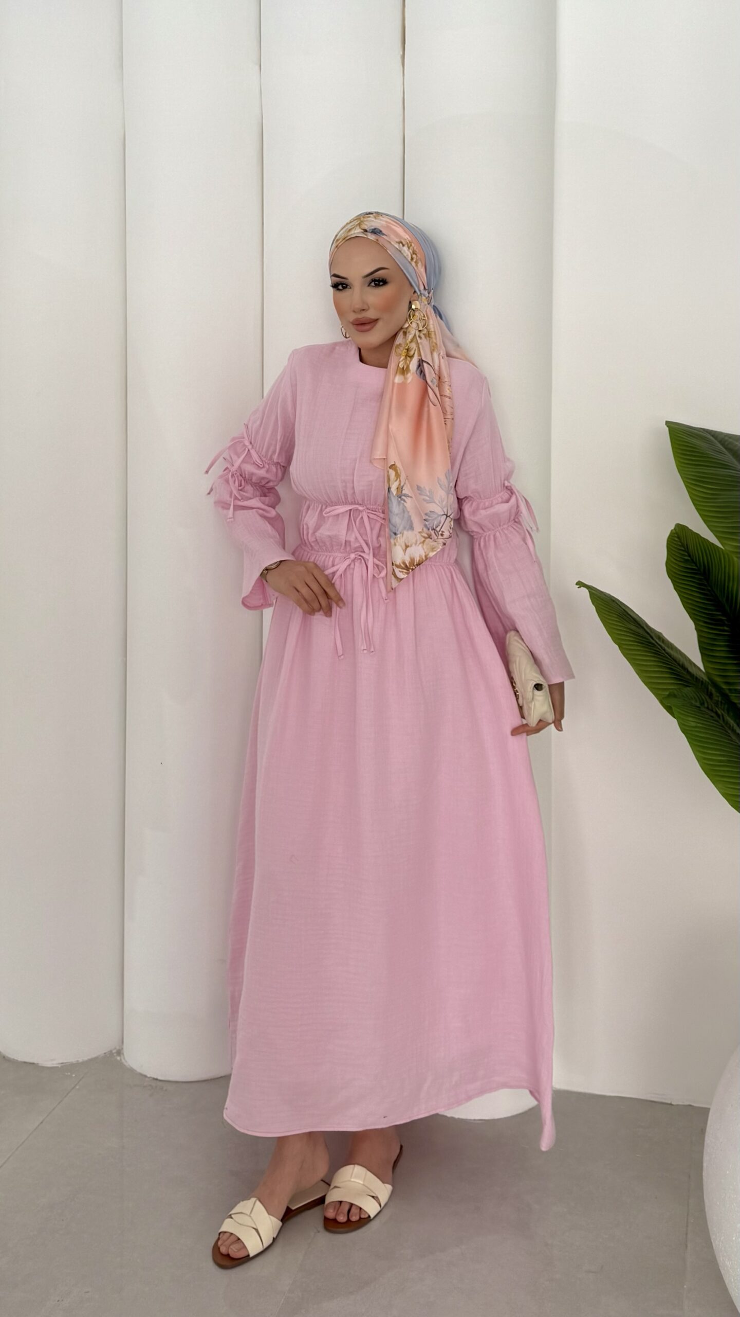 Pamuklu müslinin nefes alan hafifliği ile ketenin doğal dokusunu bir araya getiren , yaz günlerine layık tatlı bir serinlik sunar. Hareket ettikçe dalgalanarak güneş ışığını elbisenizin her kıvrımında yakalar.