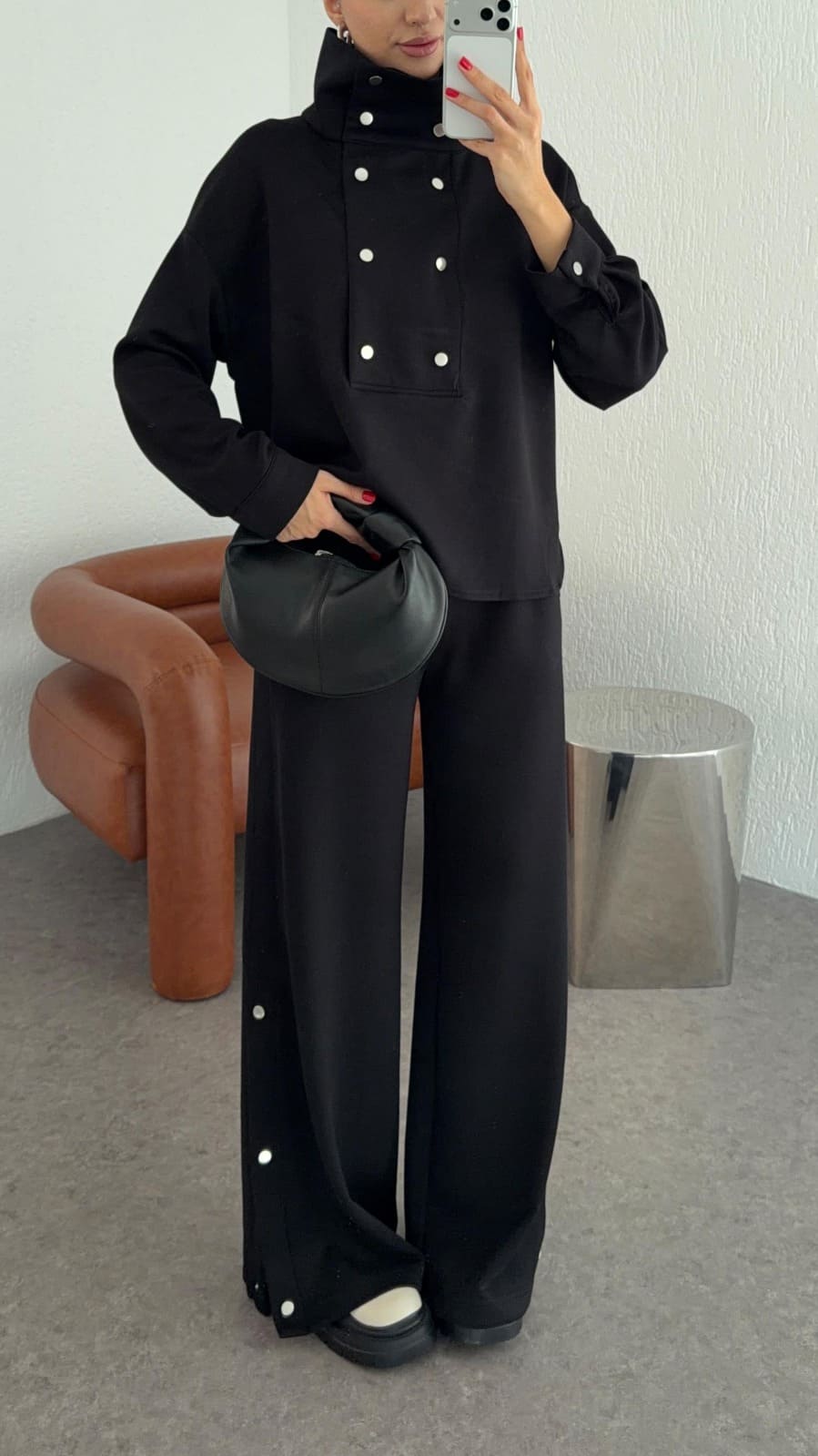 Yumuşak dokusu ve bol kesimi sayesinde hem günlük hayatta hem de özel anlarda rahatlıkla tercih edebileceğiniz bu iki parçalı set, zahmetsiz şıklığın anahtarını sunuyor. Şık çıtçıt detayları, takıma modern bir dokunuş katarken aynı zamanda pratik bir kullanım kolaylığı sağlar. Minimal tasarımı ve zarif hatlarıyla her stile uyum sağlayan bu set, gün boyu konforu ve tarzı bir arada sunar.